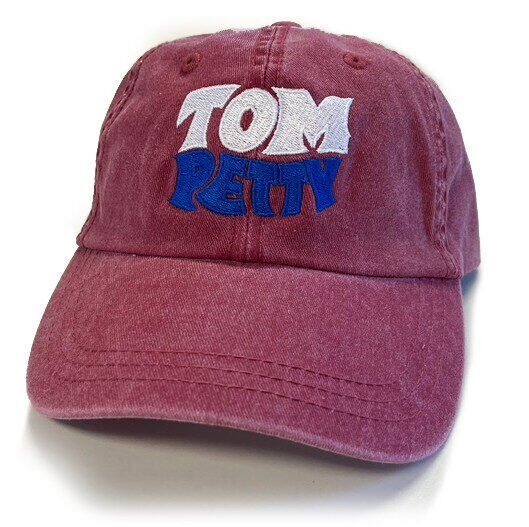This is a pigment washed red hat with white & blue embroidery reading "TOM PETTY". It is a Bluescentric Brand 6-paneled unstructured, adjustable low profile hat, made from 100% cotton twill, with a brass buckle in the back.
