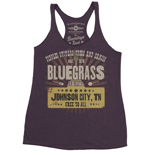 The Bluescentric Brand Bluegrass Racerback Tank is a premium Next Level brand fabric-laundered 4.2oz triblend 50/25/25 polyester/combed ringspun cotton/rayon racerback tee.