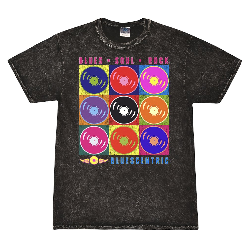 This t-shirt design features the Bluescentric trademark vinyl record in a pop culture format. The top reads Blues • Soul • Rock, the bottom reads "Bluescentric"