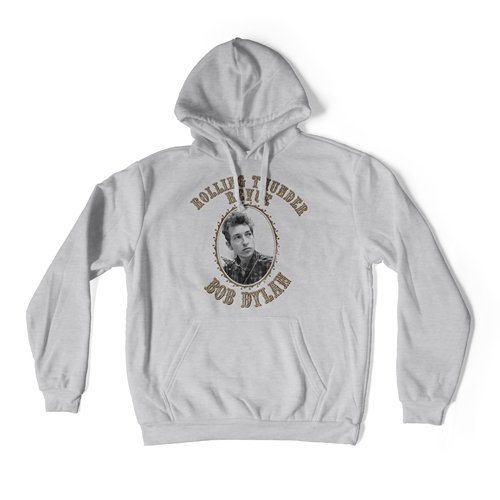 This design features a photo of young Bob Dylan with his harmonica, promoting the famed Rolling Thunder Revue. The graphic style comes directly from original tour promotional material, including the curved text being slightly off-kilter.