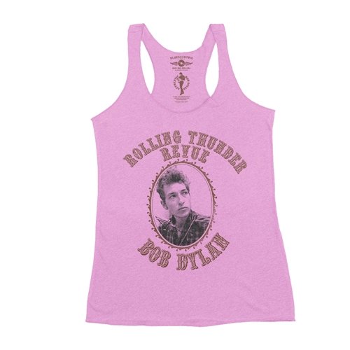 This design features a photo of young Bob Dylan with his harmonica, promoting the famed Rolling Thunder Revue. The graphic style comes directly from original tour promotional material, including the curved text being slightly off-kilter.