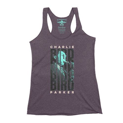 The Bluescentric Brand authentic Charlie Parker Racerback Tank is available in comfortable, relaxed-fit women's sizes up to 2XL. The material is premium fabric-laundered 4.2oz triblend 50/25/25 polyester/combed ringspun cotton/rayon with a racer back.