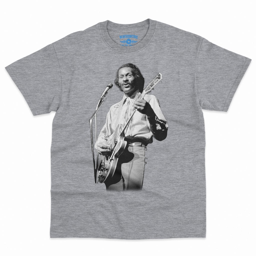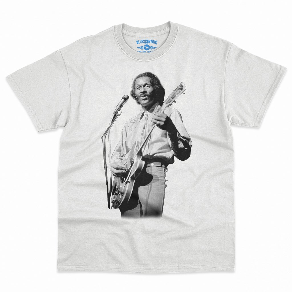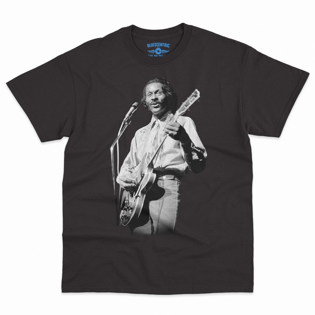 This official Chuck Berry t-shirt simply features a photo of Chuck playing guitar. Support the man who invented rock n roll!