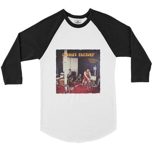 This official Creedence Clearwater Revival raglan baseball shirt comes in comfortable, lightweight 4oz 91/9 poly/ringspun cotton sizes up to 2XL. The design features the band's fifth and breakout hit album, Cosmo's Factory with slightly distressed edges.