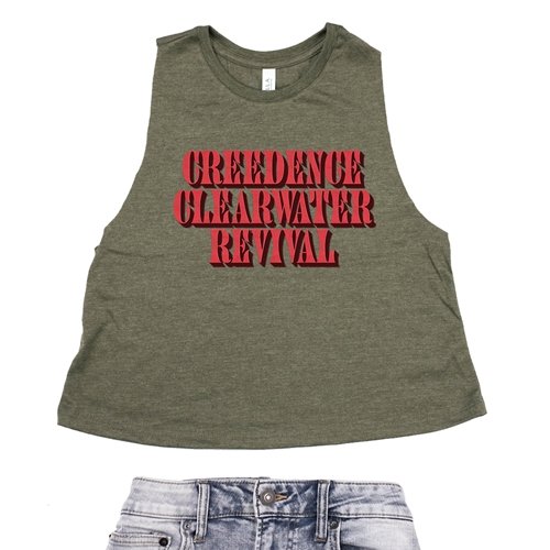 The Bluescentric Brand Creedence Clearwater Revival Racerback Crop Top comes in relaxed cropped-fit sizes Small through 2XL. It is 52% airlume combed/ring-spun cotton, 48% poly jersey, racerback and features raw edge (unsewn) arm holes.