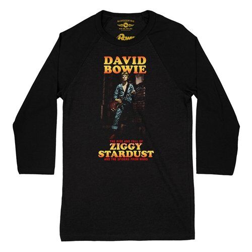 This is a Bluescentric Brand authentic David Bowie baseball tee, available in comfortable sizes up to 2XL. The material is lightweight 4oz 91/9 poly/ringspun cotton with 3/4 length sleeves.