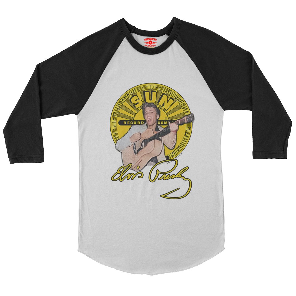 This fun official t-shirt features both Elvis Presley and Sun Records! Elvis x Sun Record Collaboration. This photo of Elvis was taken in Tampa Florida in 1955, when Elvis Presley's hip-shaking fast paced brand of Mississippi blues was sweeping the nation! Fueled by Memphis' ambitious label Sun Records, Elvis was quickly becoming the world's first super-star. Shirt design also features Elvis' custom guitar, Elvis' signature and the Sun Records Logo.