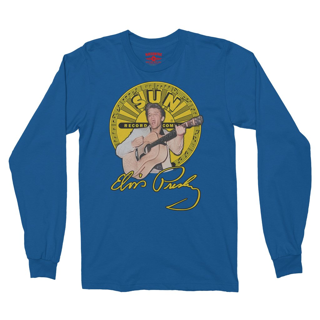 This fun official t-shirt features both Elvis Presley and Sun Records! Elvis x Sun Record Collaboration. This photo of Elvis was taken in Tampa Florida in 1955, when Elvis Presley's hip-shaking fast paced brand of Mississippi blues was sweeping the nation! Fueled by Memphis' ambitious label Sun Records, Elvis was quickly becoming the world's first super-star. Shirt design also features Elvis' custom guitar, Elvis' signature and the Sun Records Logo.