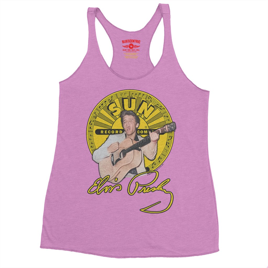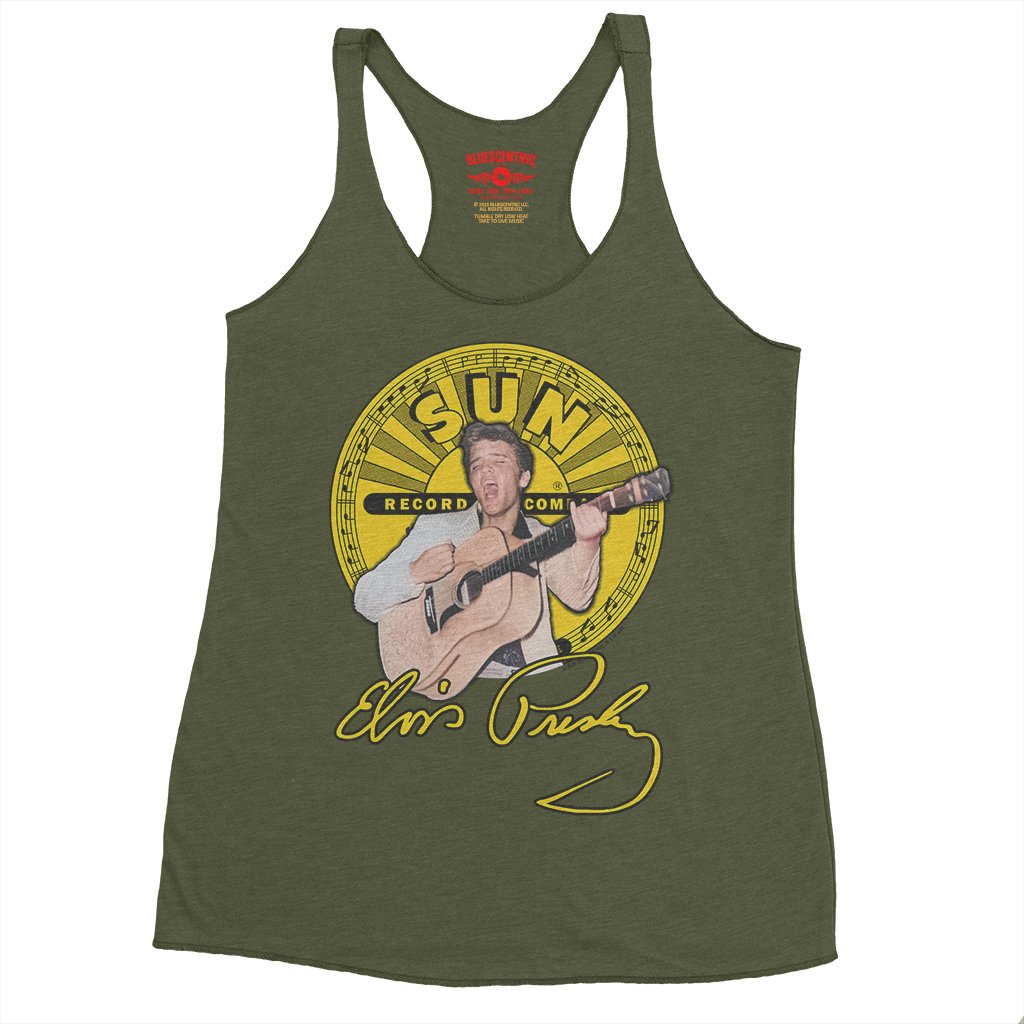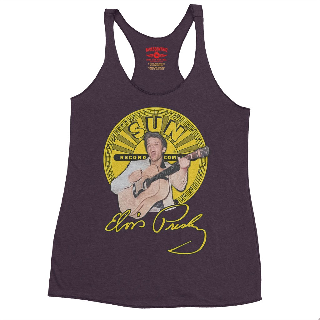 This fun official t-shirt features both Elvis Presley and Sun Records! Elvis x Sun Record Collaboration. This photo of Elvis was taken in Tampa Florida in 1955, when Elvis Presley's hip-shaking fast paced brand of Mississippi blues was sweeping the nation! Fueled by Memphis' ambitious label Sun Records, Elvis was quickly becoming the world's first super-star. Shirt design also features Elvis' custom guitar, Elvis' signature and the Sun Records Logo.
