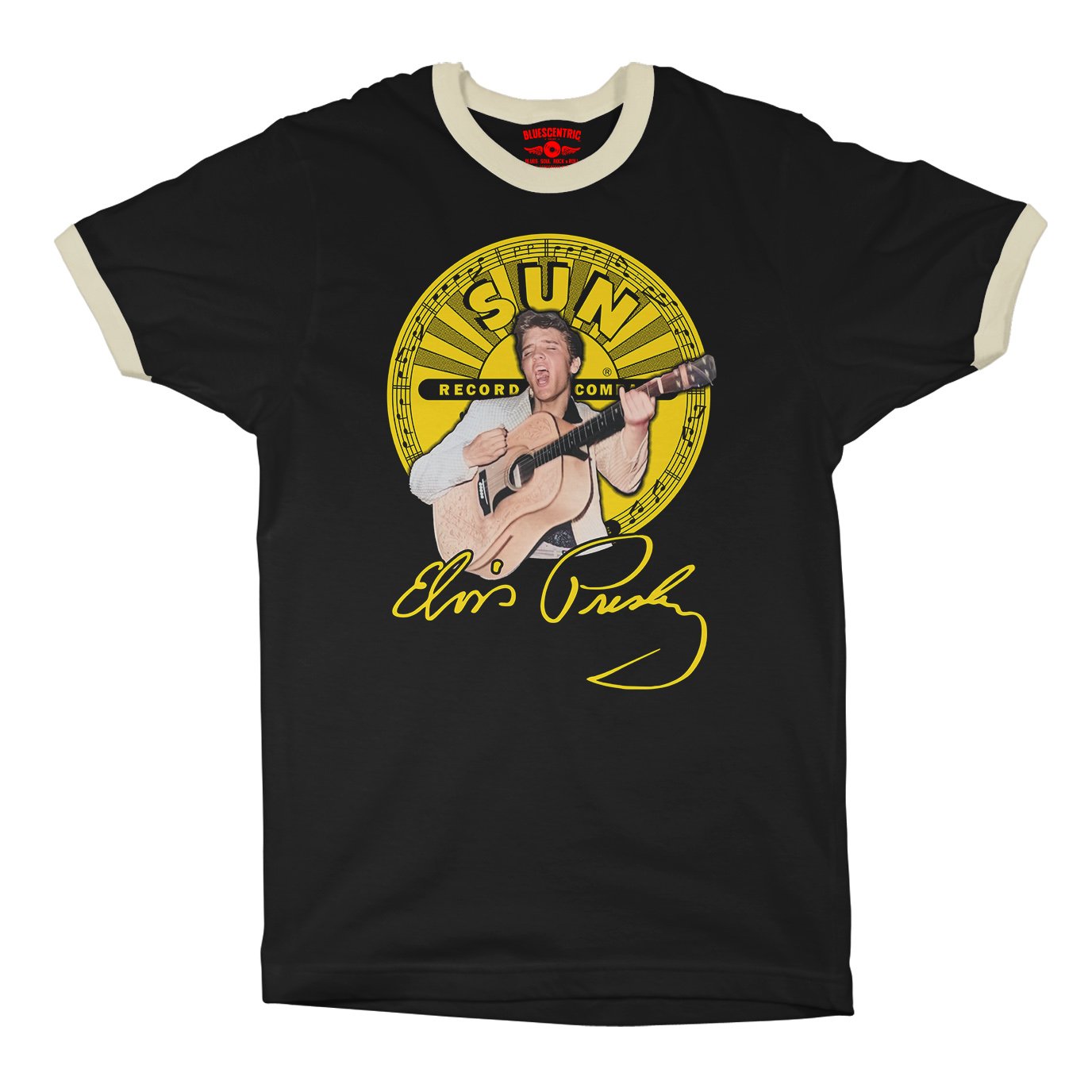 This fun official t-shirt features both Elvis Presley and Sun Records! Elvis x Sun Record Collaboration. This photo of Elvis was taken in Tampa Florida in 1955, when Elvis Presley's hip-shaking fast paced brand of Mississippi blues was sweeping the nation! Fueled by Memphis' ambitious label Sun Records, Elvis was quickly becoming the world's first super-star. Shirt design also features Elvis' custom guitar, Elvis' signature and the Sun Records Logo.