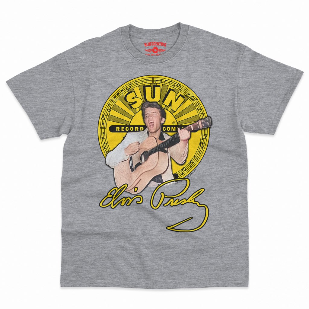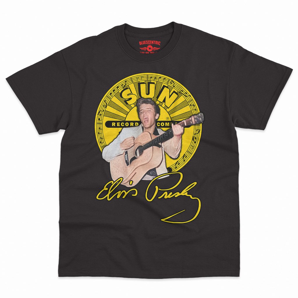This fun official t-shirt features both Elvis Presley and Sun Records! Elvis x Sun Record Collaboration. This photo of Elvis was taken in Tampa Florida in 1955, when Elvis Presley's hip-shaking fast paced brand of Mississippi blues was sweeping the nation! Fueled by Memphis' ambitious label Sun Records, Elvis was quickly becoming the world's first super-star. Shirt design also features Elvis' custom guitar, Elvis' signature and the Sun Records Logo.