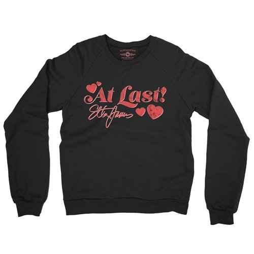 Official Etta James! This design features the title of Etta James' iconic song "At Last" in red with hearts around the text and her signature underneath.