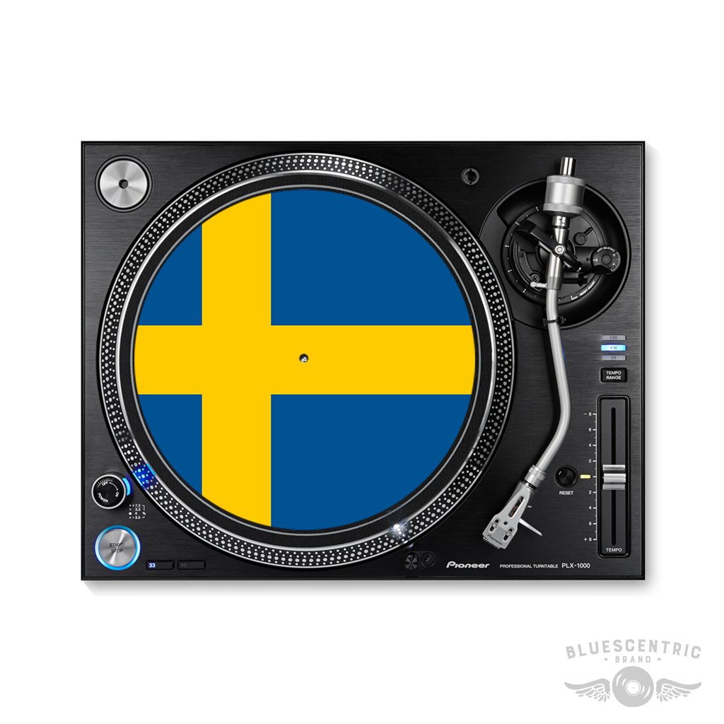 This turntable slipmat features the yellow and blue nordic cross of the Flag of Sweden, first adopted in 1906.