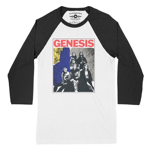 This is a Bluescentric Brand official Genesis band baseball tee, available in comfortable sizes up to 2XL. The material is lightweight 4oz 91/9 poly/ringspun cotton with 3/4 length sleeves.