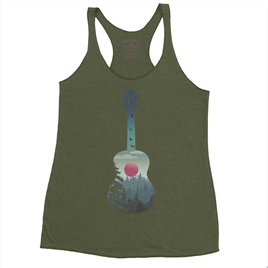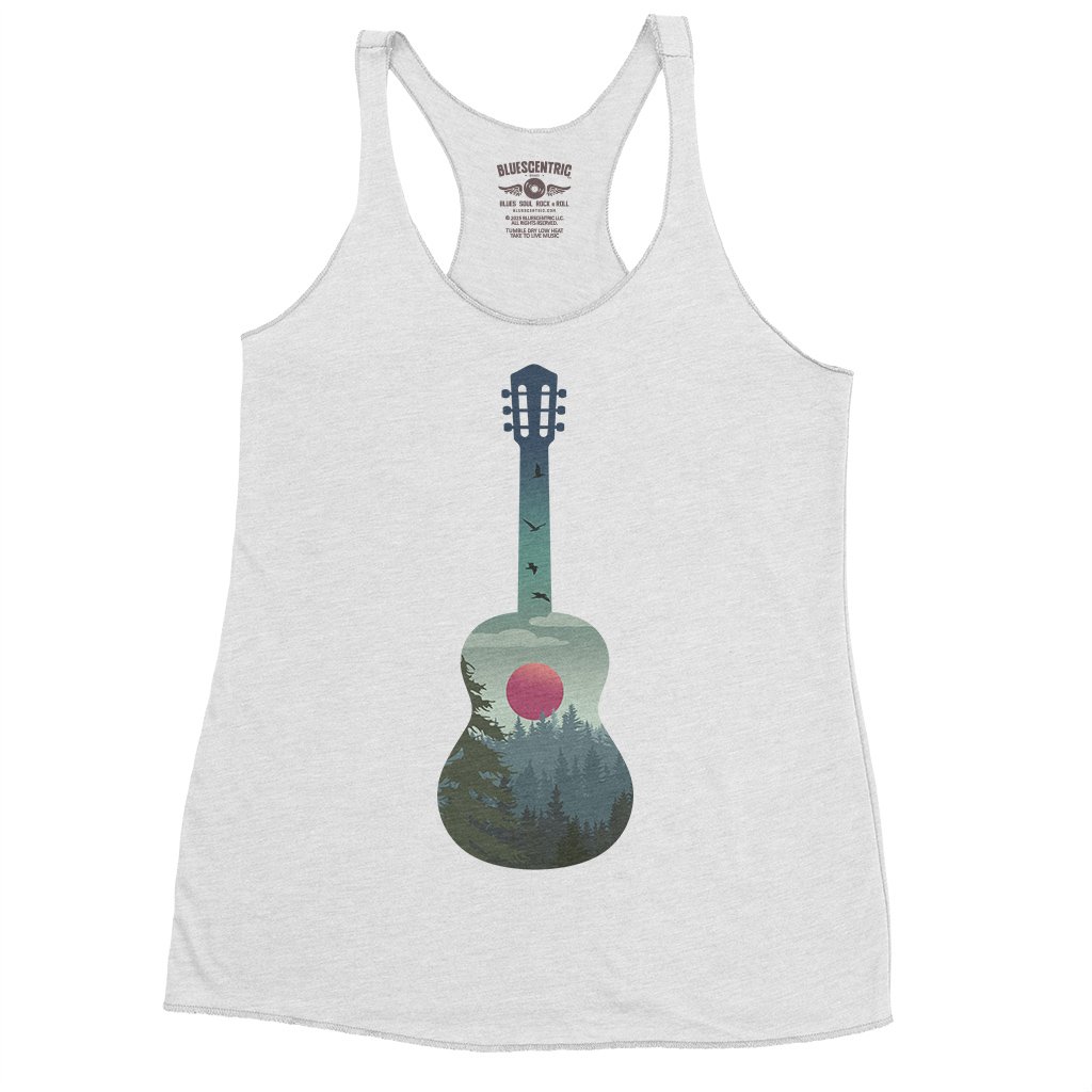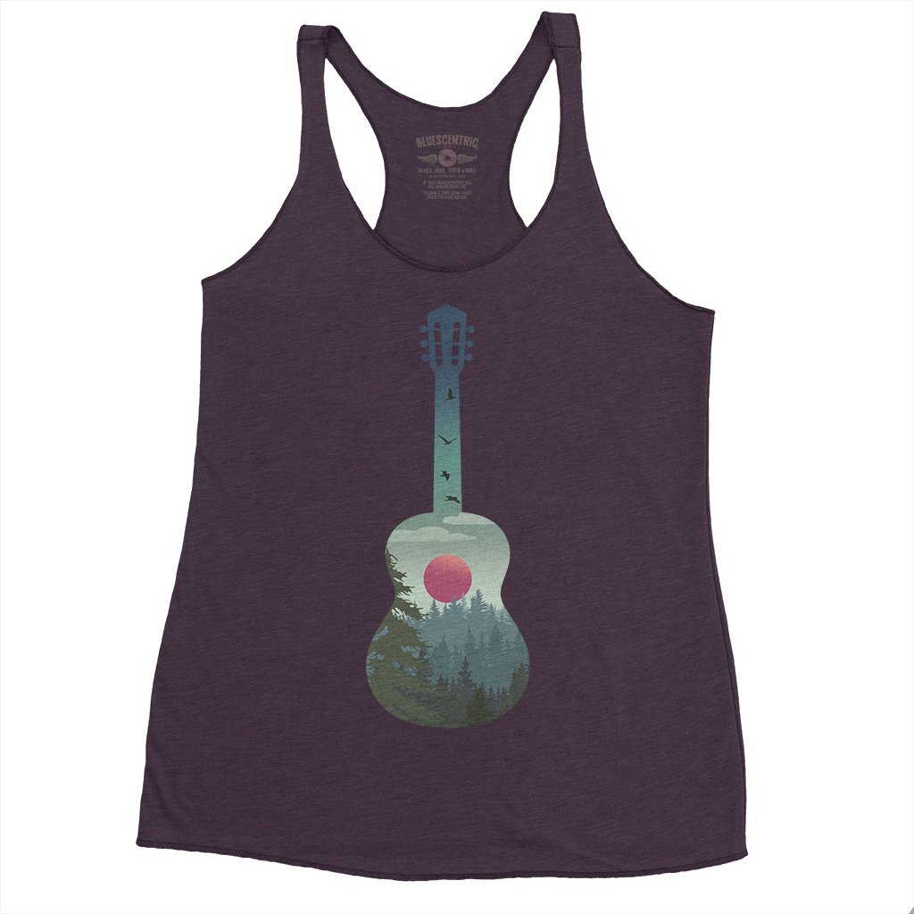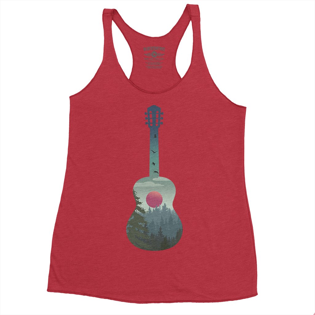 For guitar players with outdoor souls, this design features a mountaneous outdoors pine theme in the silhouette of an acoustic guitar.