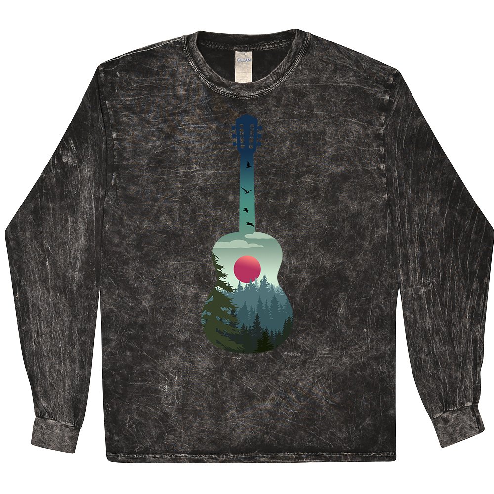 For guitar players with outdoor souls, this design features a mountaneous outdoors pine theme in the silhouette of an acoustic guitar.