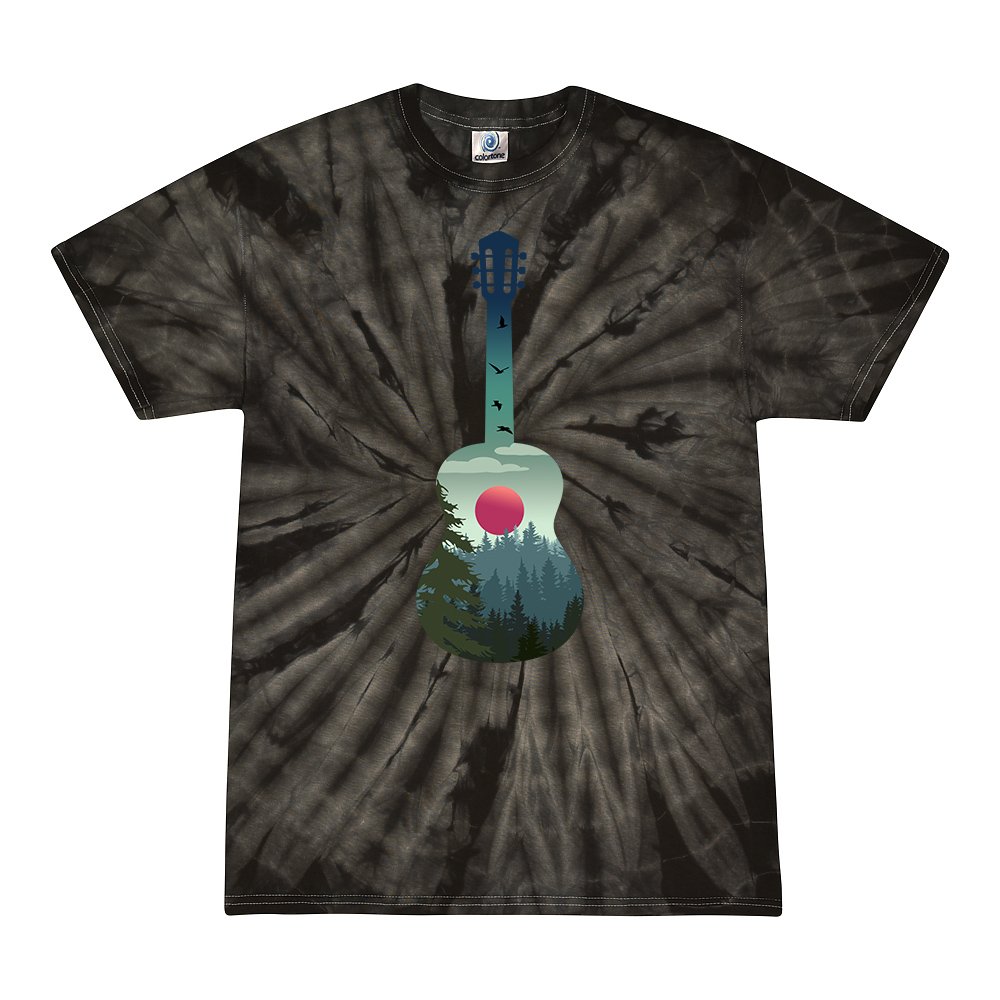For guitar players with outdoor souls, this design features a mountaneous outdoors pine theme in the silhouette of an acoustic guitar.