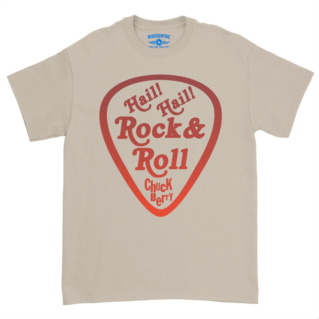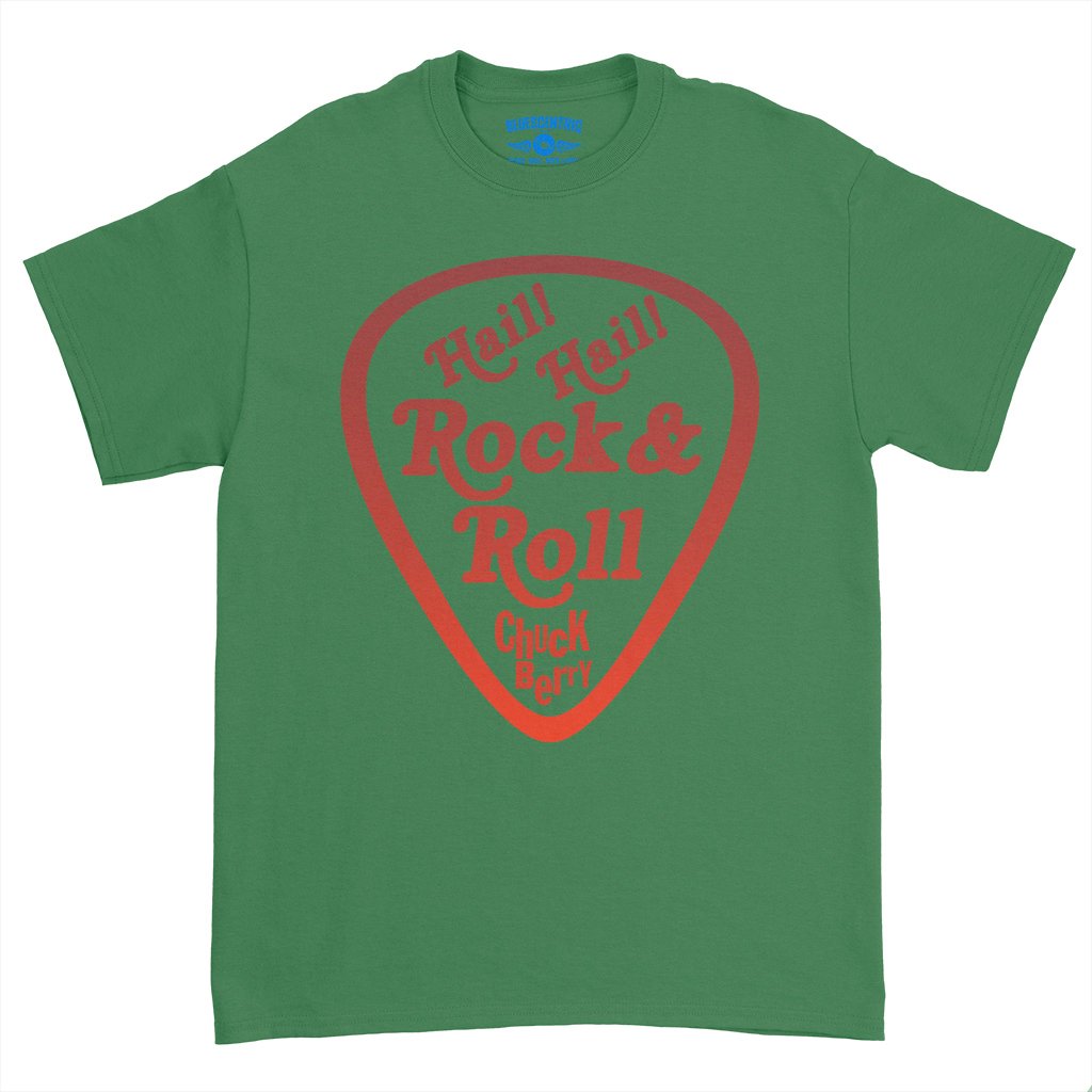This official Chuck Berry t-shirt reads "Hail! Hail! Rock n Roll!" in a guitar pick. It also features a Chuck Berry logo. The famous line comes from Chuck's 1957 song "School Days", and was later used as the title to the 1987 Chuck Berry rockumentary.