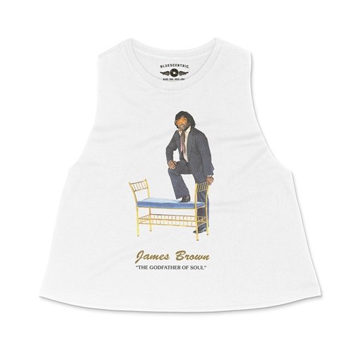 The Bluescentric Brand authentic James Brown Racerback Crop Top comes in relaxed cropped-fit sizes Small through 2XL. It is 52% airlume combed/ring-spun cotton, 48% poly jersey, racerback and features raw edge (unsewn) arm holes.