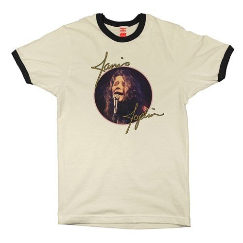 This is a Bluescentric Brand Janis Joplin ringer tee, available in comfortable sizes up to 2XL. The material is 4.3 oz 100% combed ringspun cotton fine jersey. It features side seams and contrasting 1x1 baby rib binded collar and sleeves.
