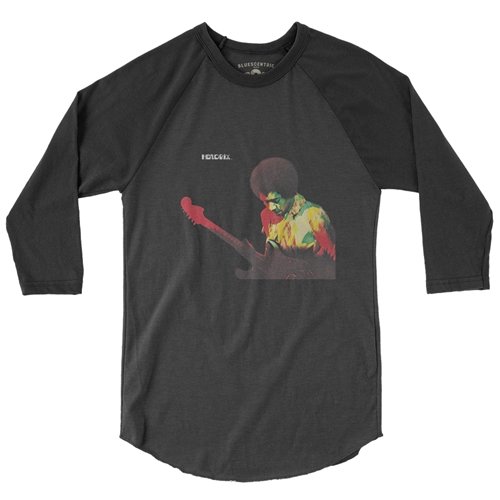 This is a Bluescentric Brand official Jimi Hendrix baseball tee, available in comfortable sizes up to 2XL. The material is lightweight 4oz 91/9 poly/ringspun cotton with 3/4 length sleeves.