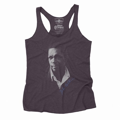 The Bluescentric Brand authentic John Coltrane Racerback Tank is available in comfortable, relaxed-fit women's sizes up to 2XL. The material is premium fabric-laundered 4.2oz triblend 50/25/25 polyester/combed ringspun cotton/rayon with a racer back.
