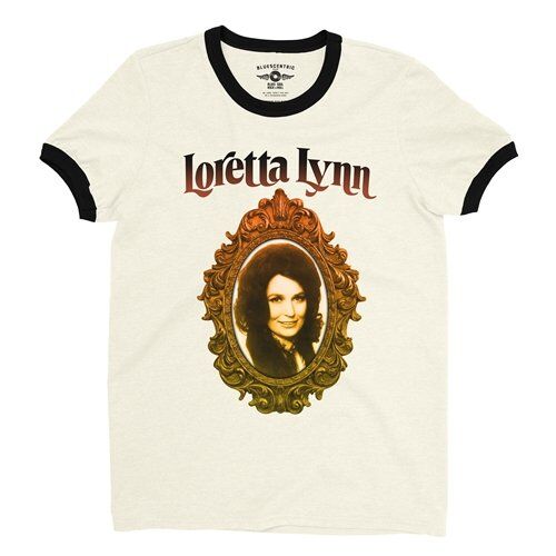 This is a Bluescentric Brand authentic Loretta Lynn ringer tee, available in comfortable sizes up to 2XL. The material is 4.3 oz 100% combed ringspun cotton fine jersey. It features side seams and contrasting 1x1 baby rib binded collar and sleeves.