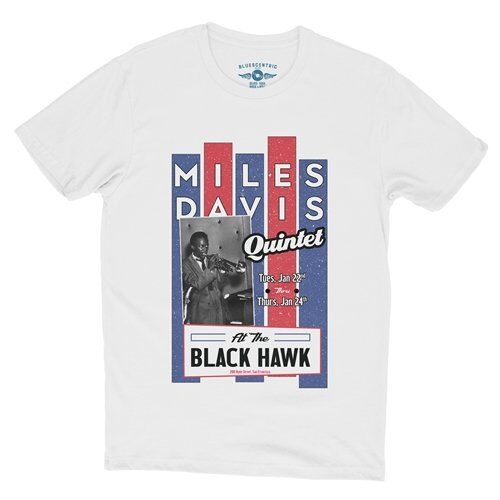 Miles Davis played a number of engagements at The Blackhawk, San Fransisco's iconic and pivotal Jazz lounge. The 1957 engagement featured on this Miles Davis t-shirt included a now-legendary Jazz quintet lineup of John Coltrane on tenor saxophone, Red Garland on piano, Paul Chambers on bass and "Philly" Joe Jones on drums. Miles, of course, played trumpet.