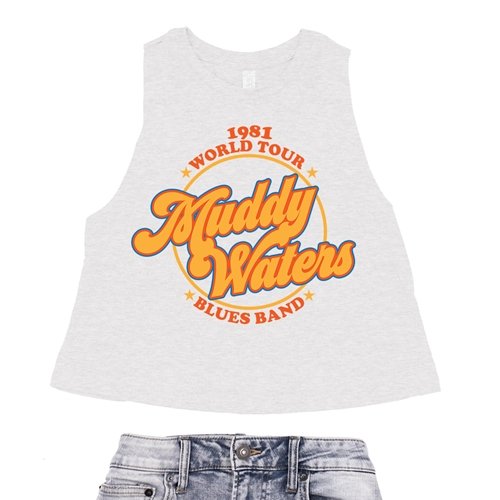 The Bluescentric Brand Muddy Waters Racerback Crop Top comes in relaxed cropped-fit sizes Small-Large. It is 52% airlume combed/ring-spun cotton, 48% poly jersey, racerback and features raw edge (unsewn) arm holes.