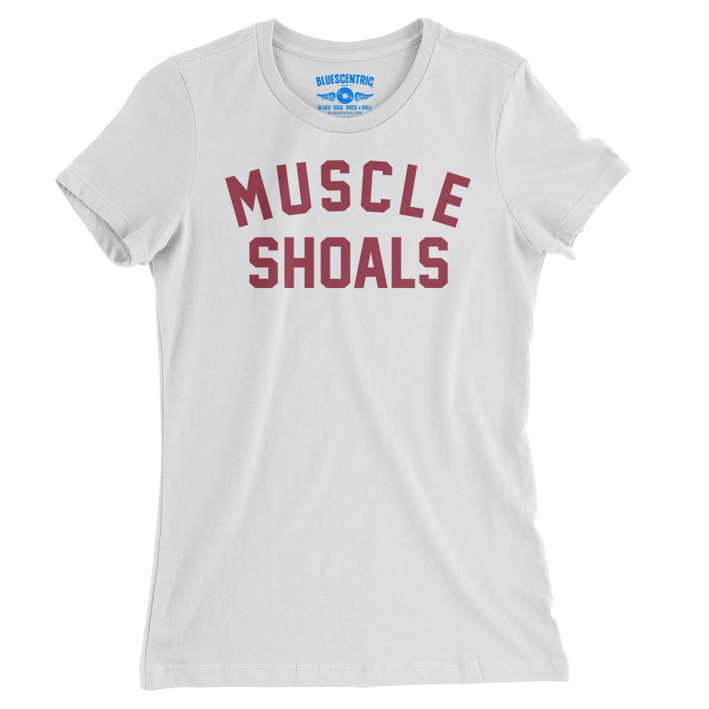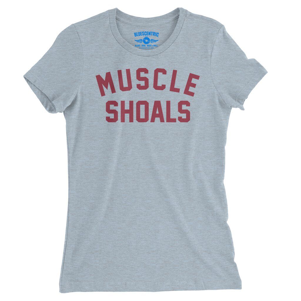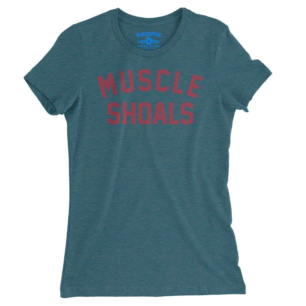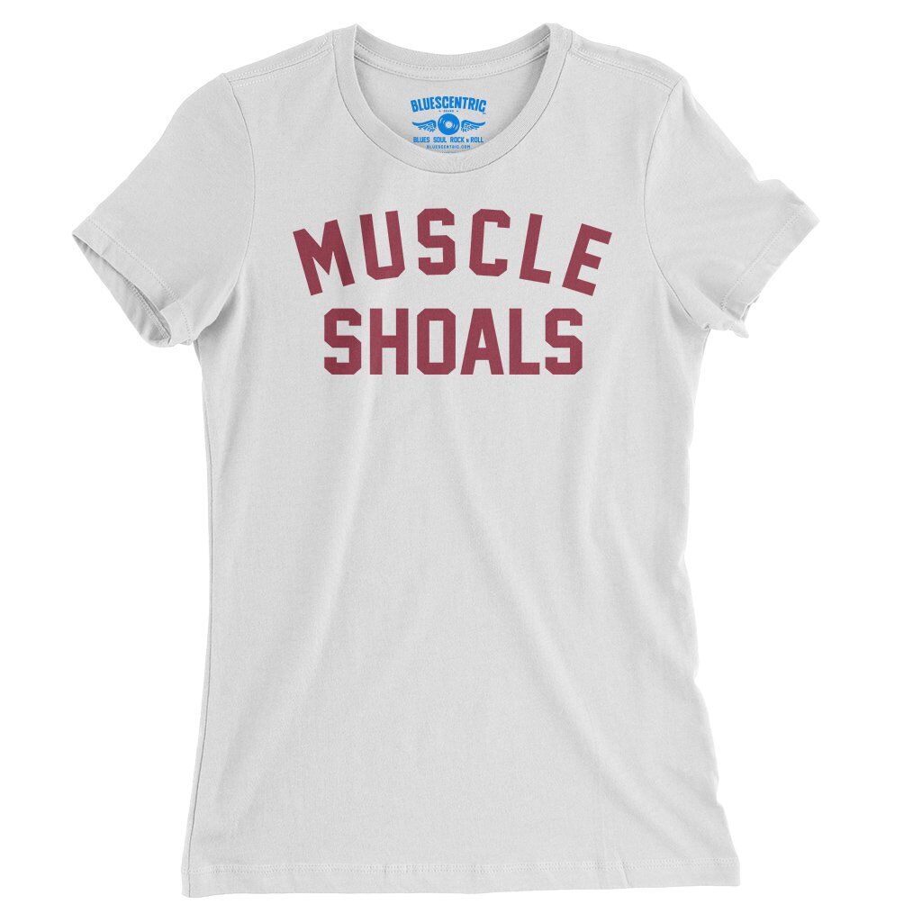 This music t-shirt reads "Muscle Shoals". Muscle Shoals, Alabama became a cornerstone of American music by blending Southern soul, blues, R&B, and rock into a sound that felt both raw and timeless. Through studios like FAME Studios and Muscle Shoals Sound Studio, local session players helped shape landmark recordings by artists ranging from Aretha Franklin to the Rolling Stones.