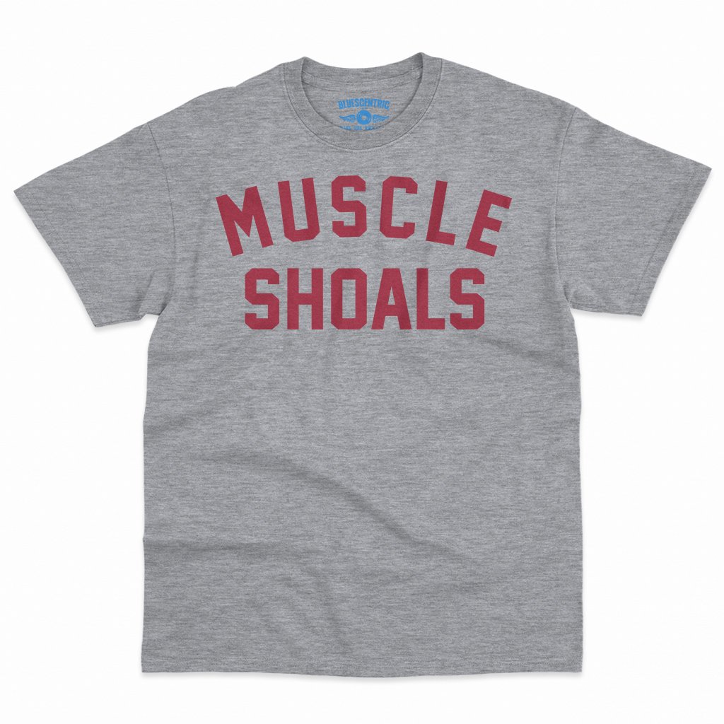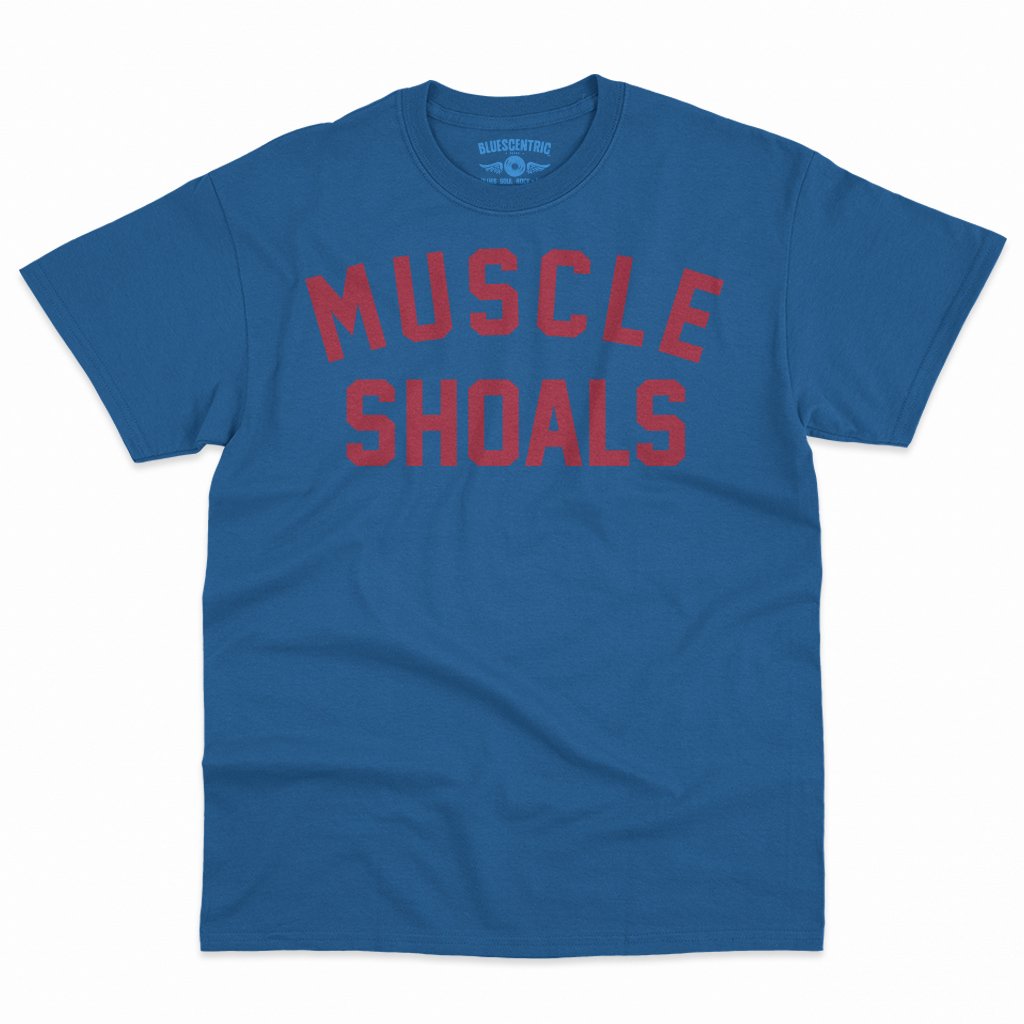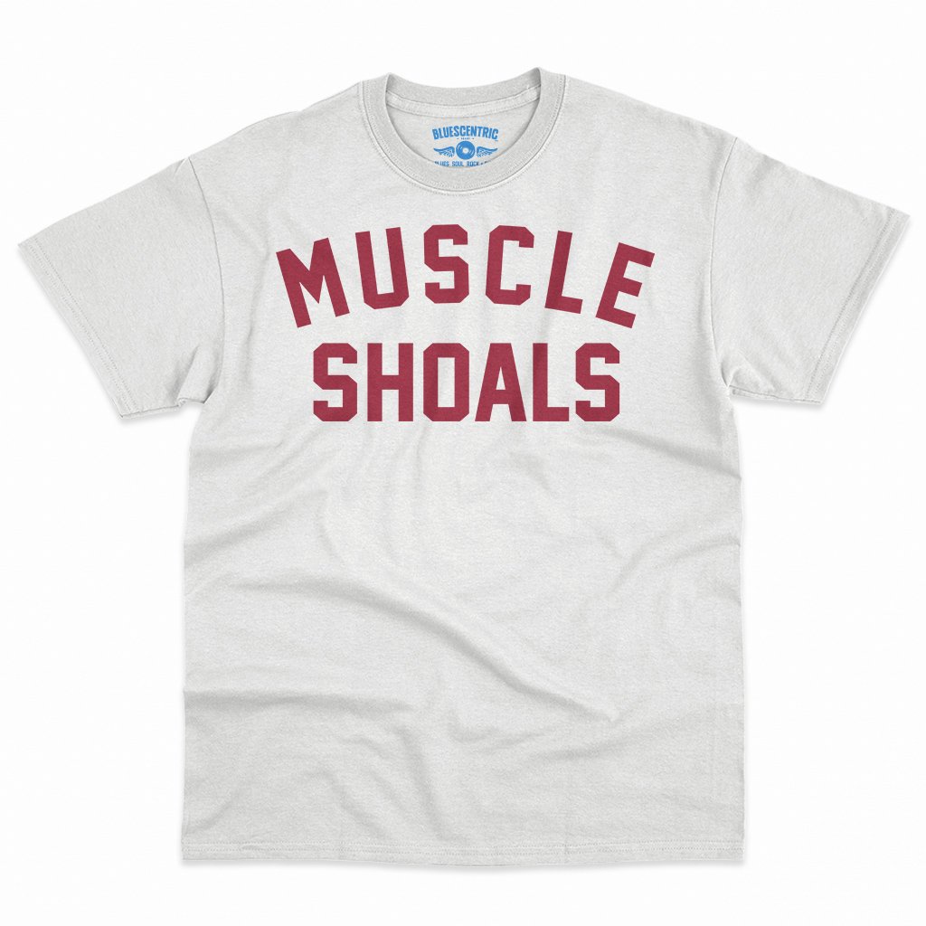 This music t-shirt reads "Muscle Shoals". Muscle Shoals, Alabama became a cornerstone of American music by blending Southern soul, blues, R&B, and rock into a sound that felt both raw and timeless. Through studios like FAME Studios and Muscle Shoals Sound Studio, local session players helped shape landmark recordings by artists ranging from Aretha Franklin to the Rolling Stones.