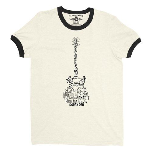 This is a Bluescentric Brand guitar ringer tee, available in comfortable sizes up to 2XL. The material is 4.3 oz 100% combed ringspun cotton fine jersey. It features side seams and contrasting 1x1 baby rib binded collar and sleeves.