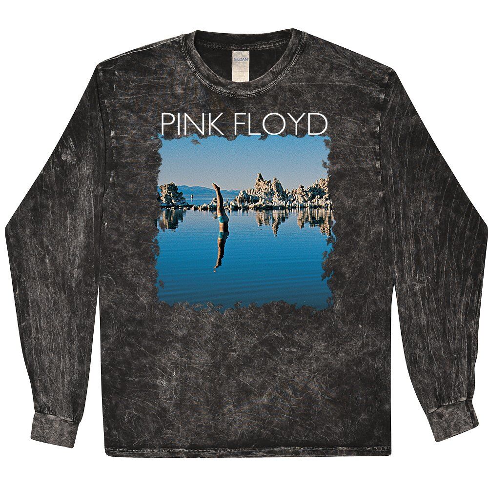 This official Pink Floyd shirt features a striking photo from the inside of Pink Floyd's Wish You Were Here album cover. It features a diver midway through diving ito a lake, but making no splash. The scene with the surreal rocky backdrop was shot in Mono Lake, California, which was an ancient saline lake with unique and strange limestone formations. The design also features the Pink Floyd logo used during the Wish You Were Here period.