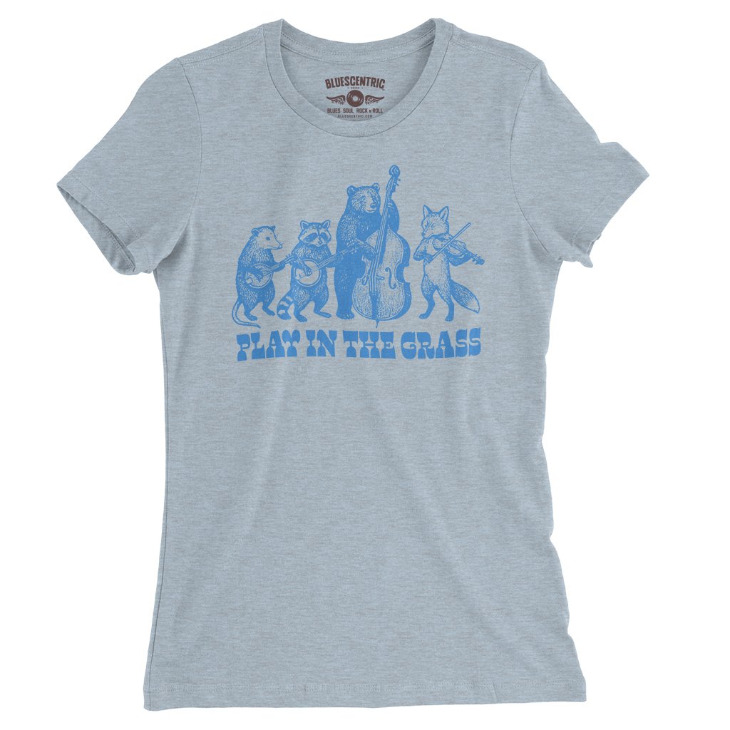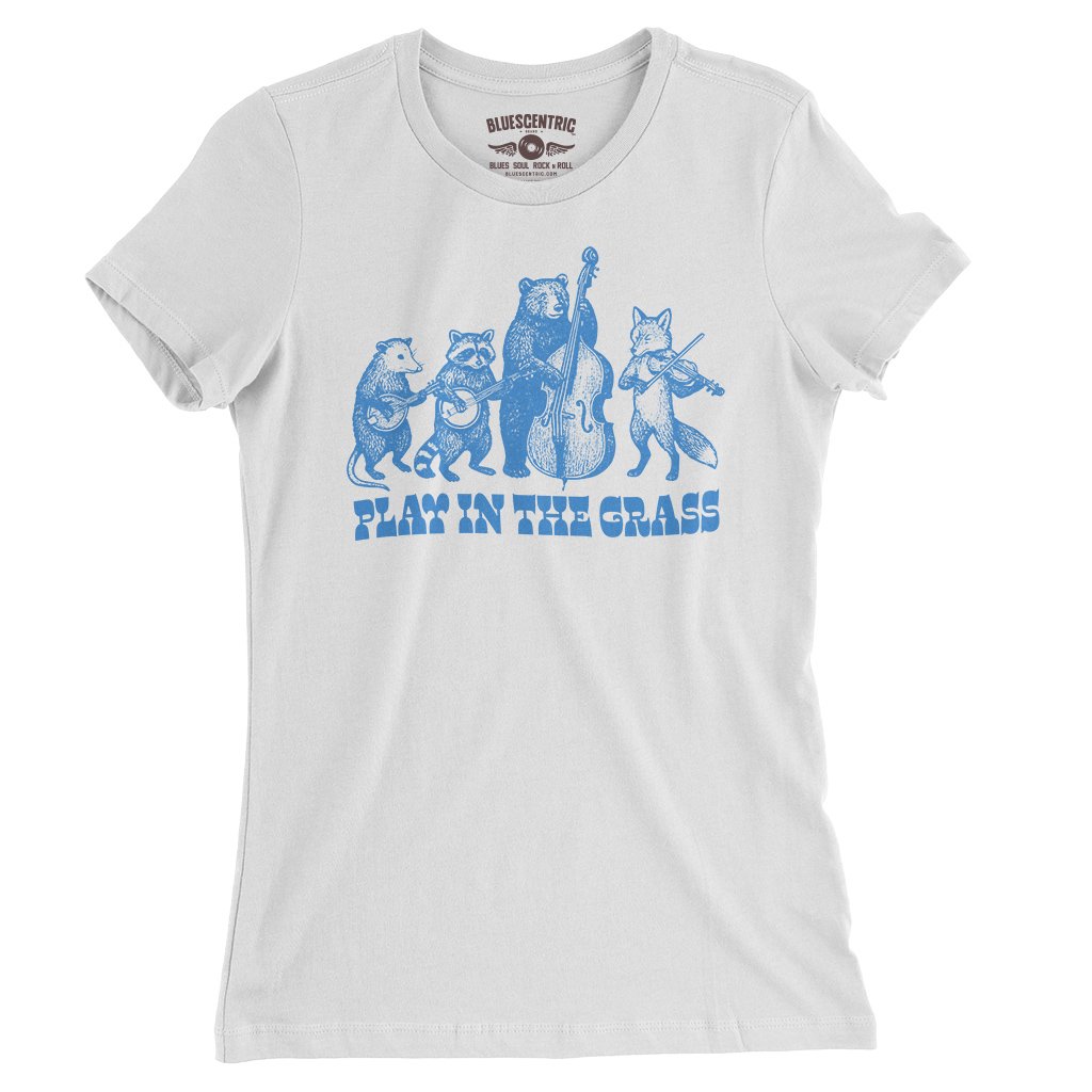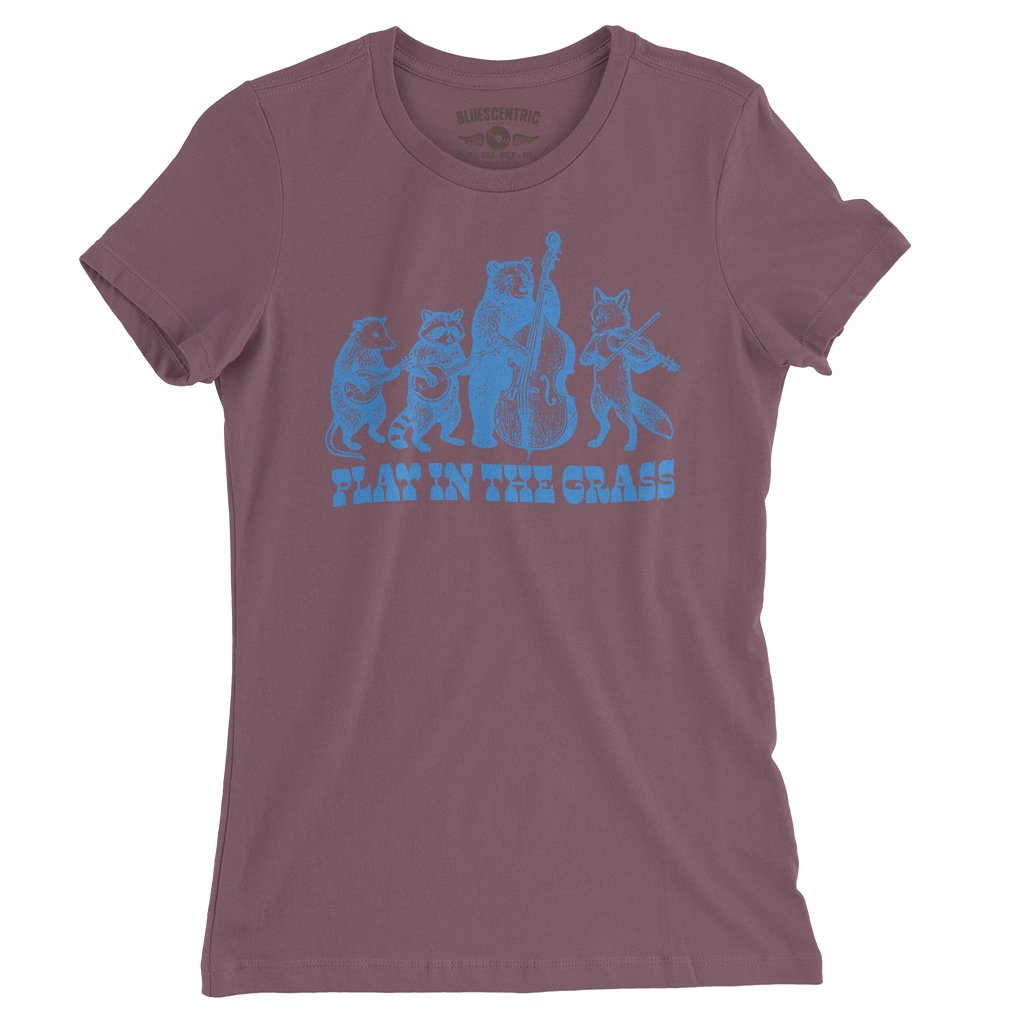 This fun bluegrass t-shirt features typical Appalachian mountainn and forest critters playing traditional Bluegrass instruments! The texxt reads "play in the grass"