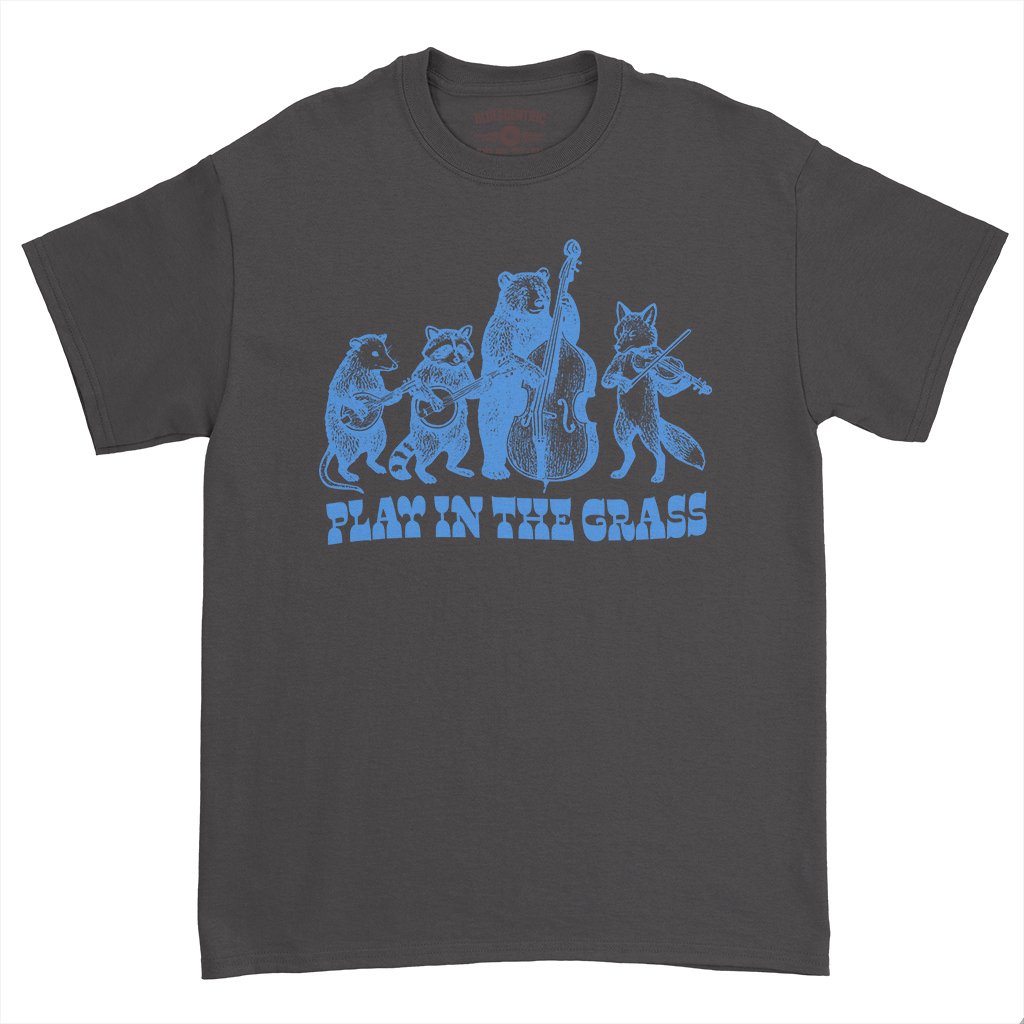 This fun bluegrass t-shirt features typical Appalachian mountainn and forest critters playing traditional Bluegrass instruments! The texxt reads "play in the grass"
