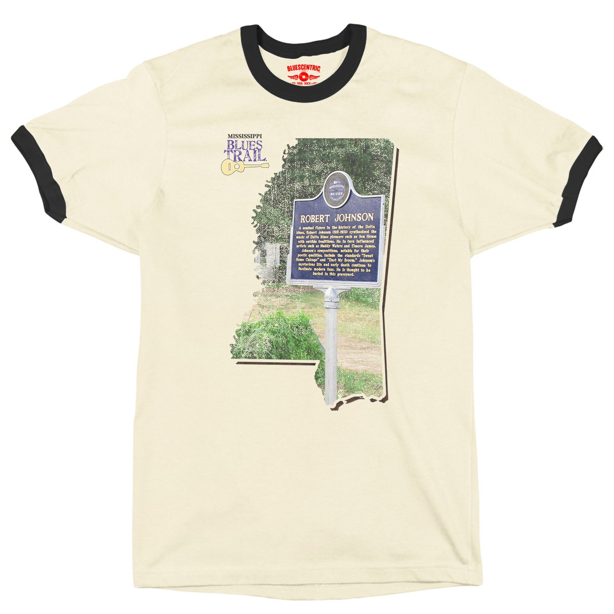 The Mississippi Blues Trail benefits from every sale of this merch! This official Mississippi Blues Trail shirt features a real photo of the Robert Johnson Mississippi Blues Trail Marker, framed in the state of Mississippi, with the Mississippi Blues Logo at the top. The marker honors the influential blues musician whose recordings became foundational to the blues canon. The marker was established as part of the Mississippi Blues Trail in 2007. You can find this Robert Johnson MS Blues Trail marker outside of Greenwood, Mississippi by Johnson's grave at the Mount Zion M.B. Church.