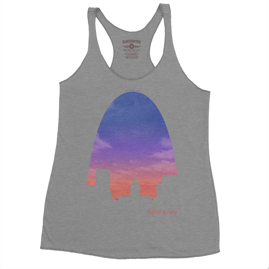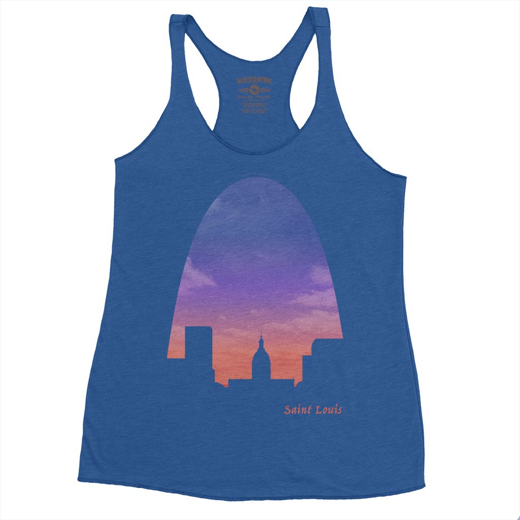 This original design features the Saint Louis Arch and the city skylineframing a peaceful evening sky in the background. In the bottom right it reads "Saint Louis"