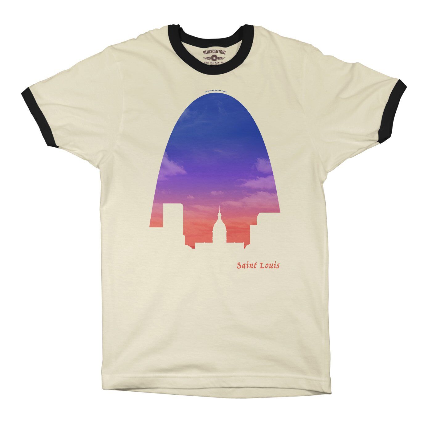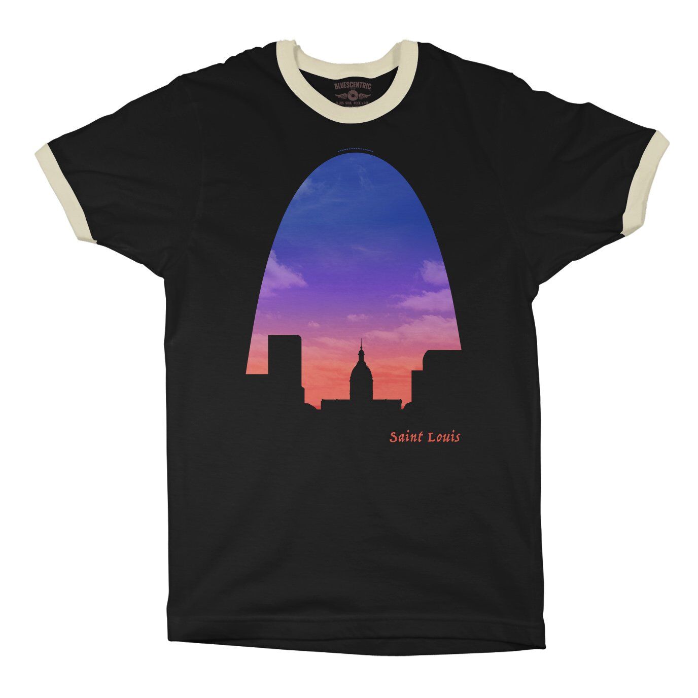 This original design features the Saint Louis Arch and the city skylineframing a peaceful evening sky in the background. In the bottom right it reads "Saint Louis"