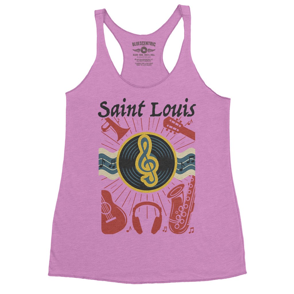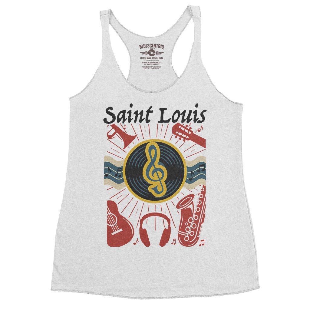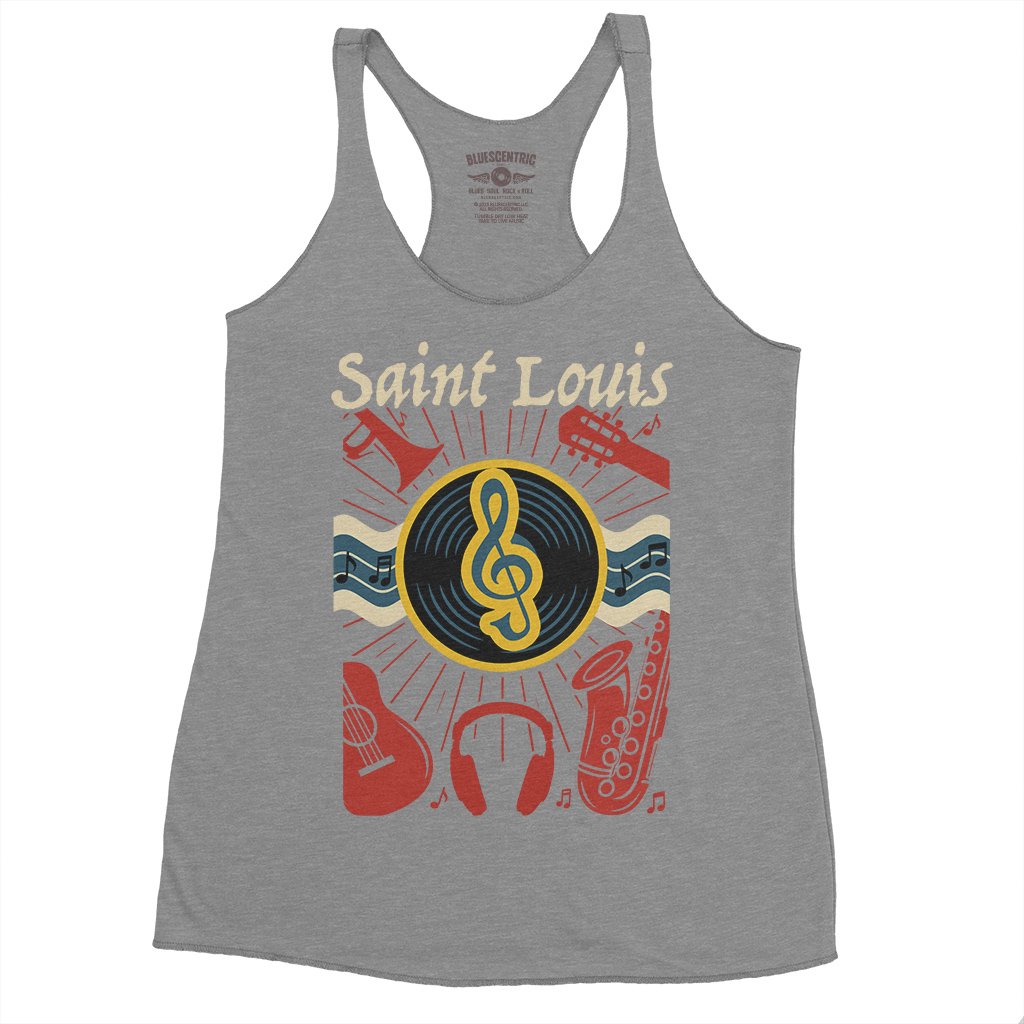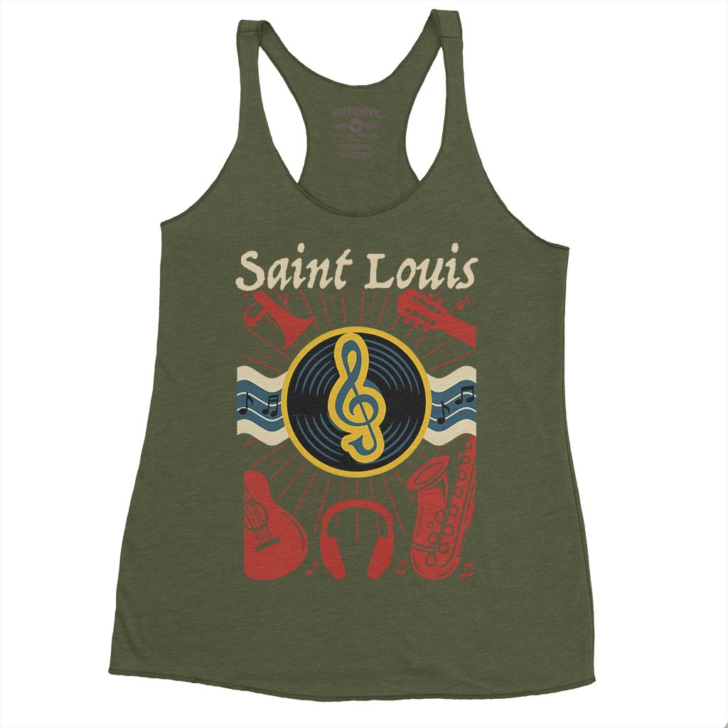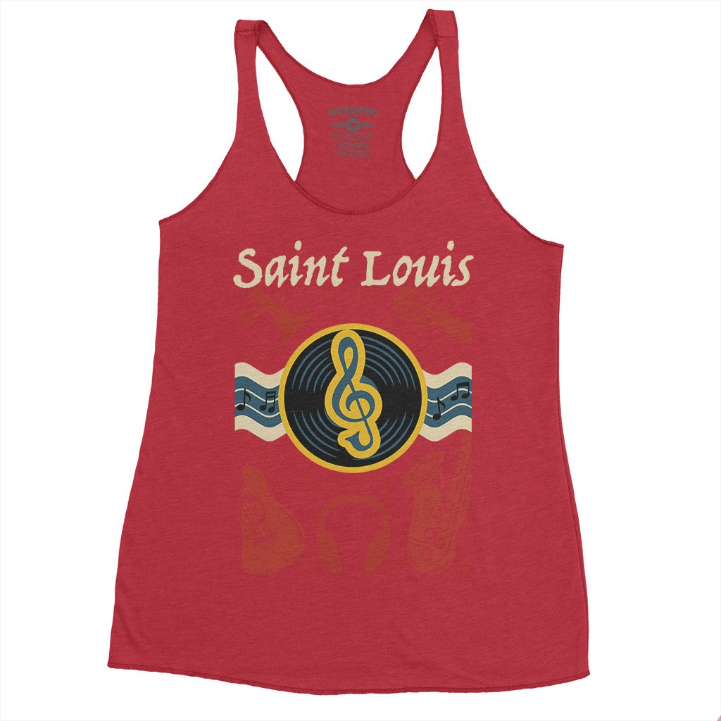 Celebrate the soul of Saint Louis with this musical design that features a variety of musical elements, and classic styles and colors of the STL flag.