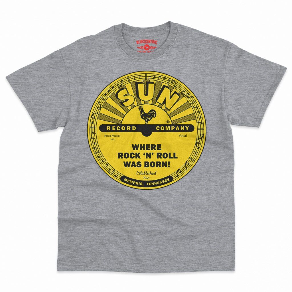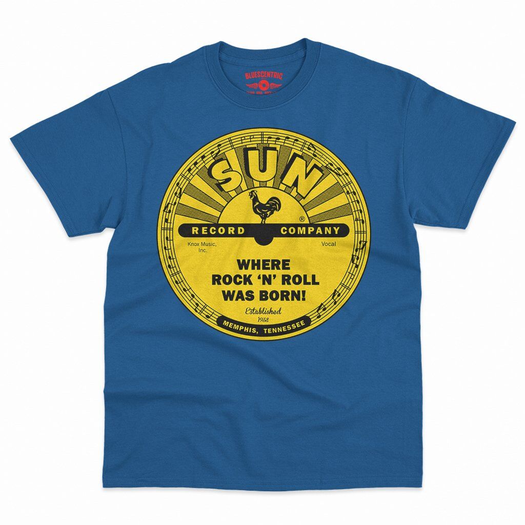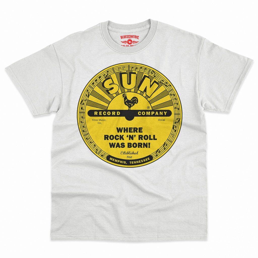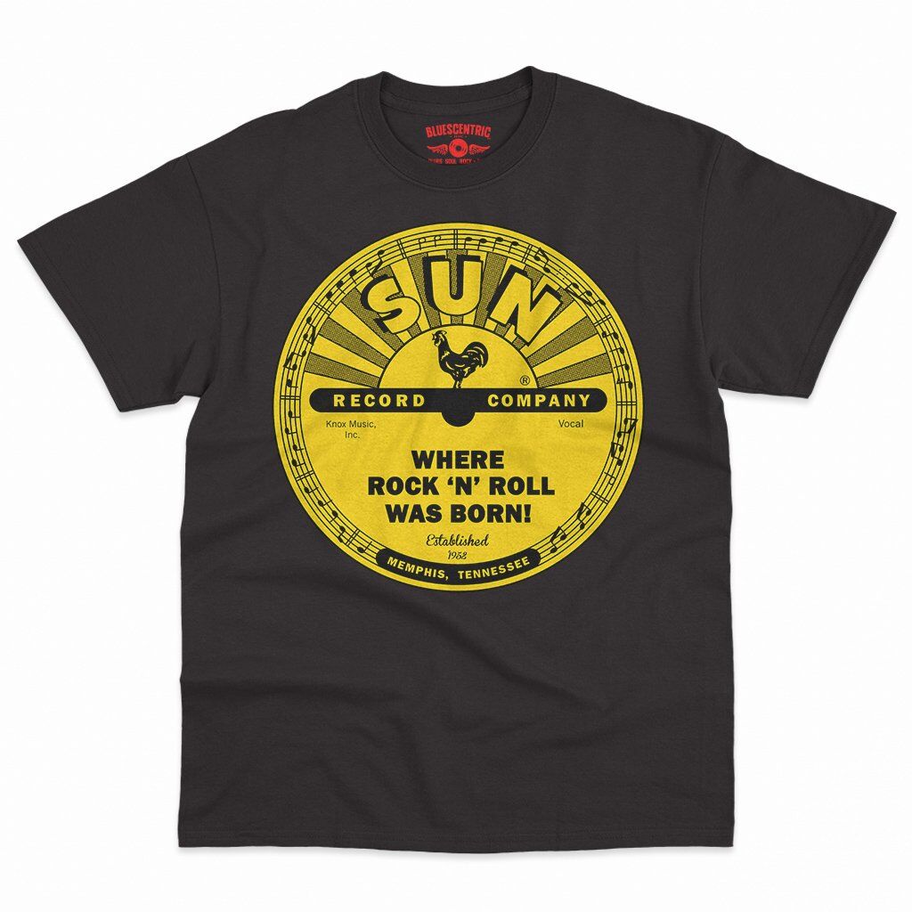 There's little doubt that rock n roll was born with Memphis' Sun Records in the mid-1950s. Sam Phillips started recording the blues, and captured the voices of new talent from the area, like Elvis Presley, Johnny Cash, Jerry Lee Lewis and Carl Perkins. The rest was rockabilly history. This band shirt design features the famous yellow Sun Records logo, and it says "Where Rock n Roll was Born" and the year of Sun's founding, 1952. The bottom reads "Memphis, Tennessee".