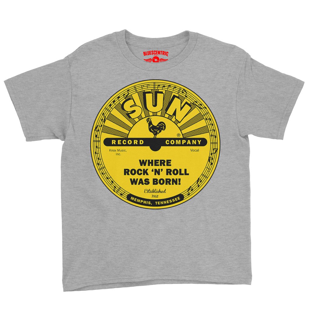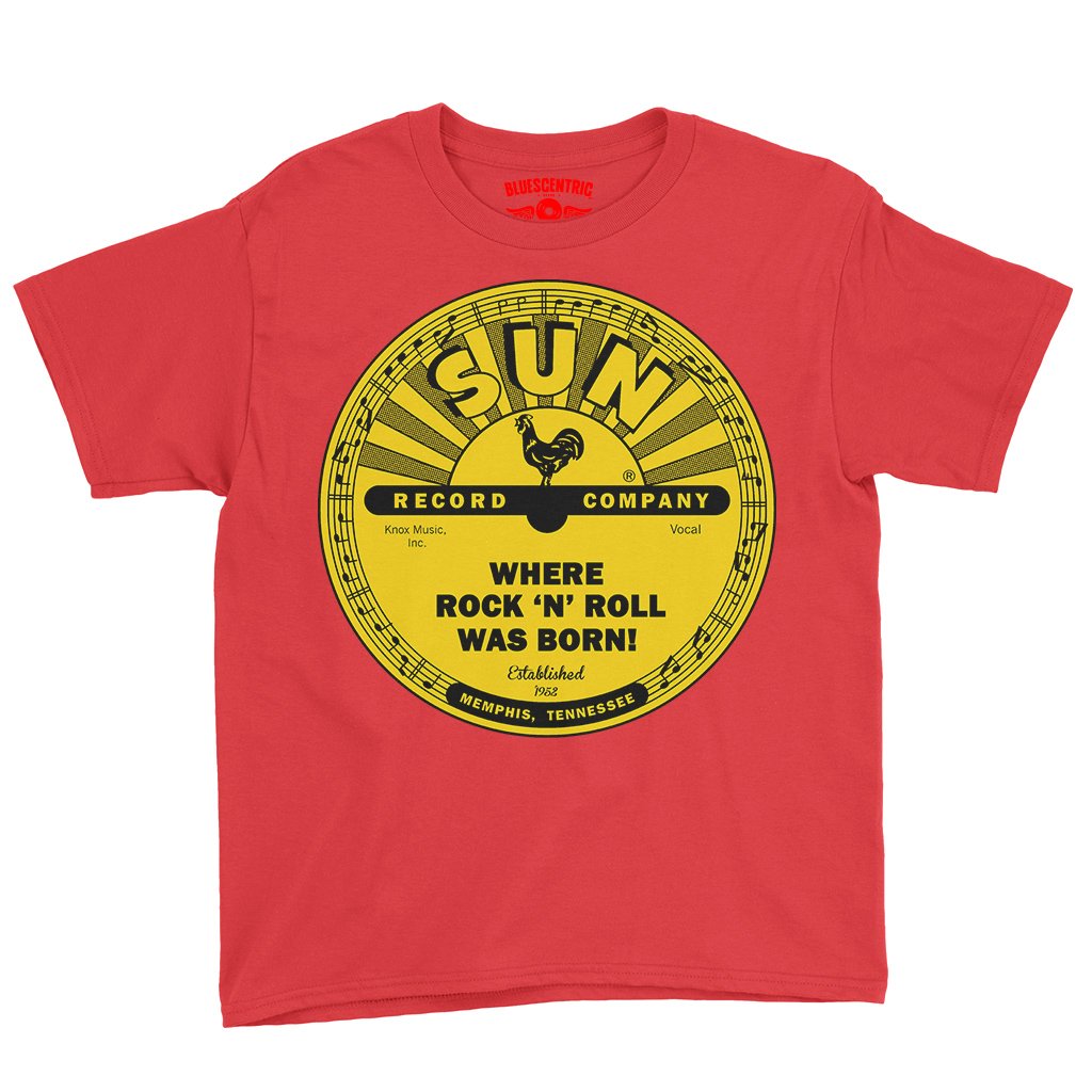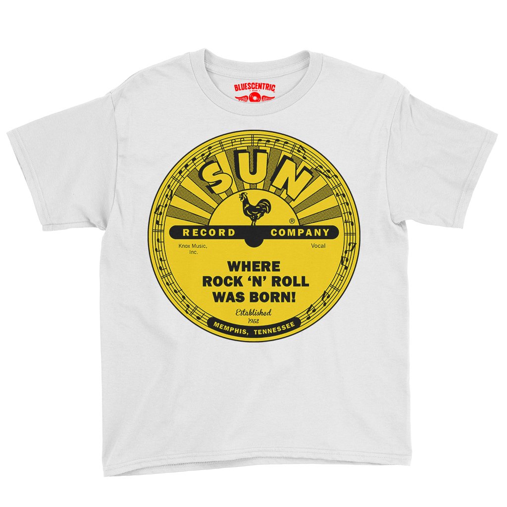 There's little doubt that rock n roll was born with Memphis' Sun Records in the mid-1950s. Sam Phillips started recording the blues, and captured the voices of new talent from the area, like Elvis Presley, Johnny Cash, Jerry Lee Lewis and Carl Perkins. The rest was rockabilly history. This band shirt design features the famous yellow Sun Records logo, and it says "Where Rock n Roll was Born" and the year of Sun's founding, 1952. The bottom reads "Memphis, Tennessee".