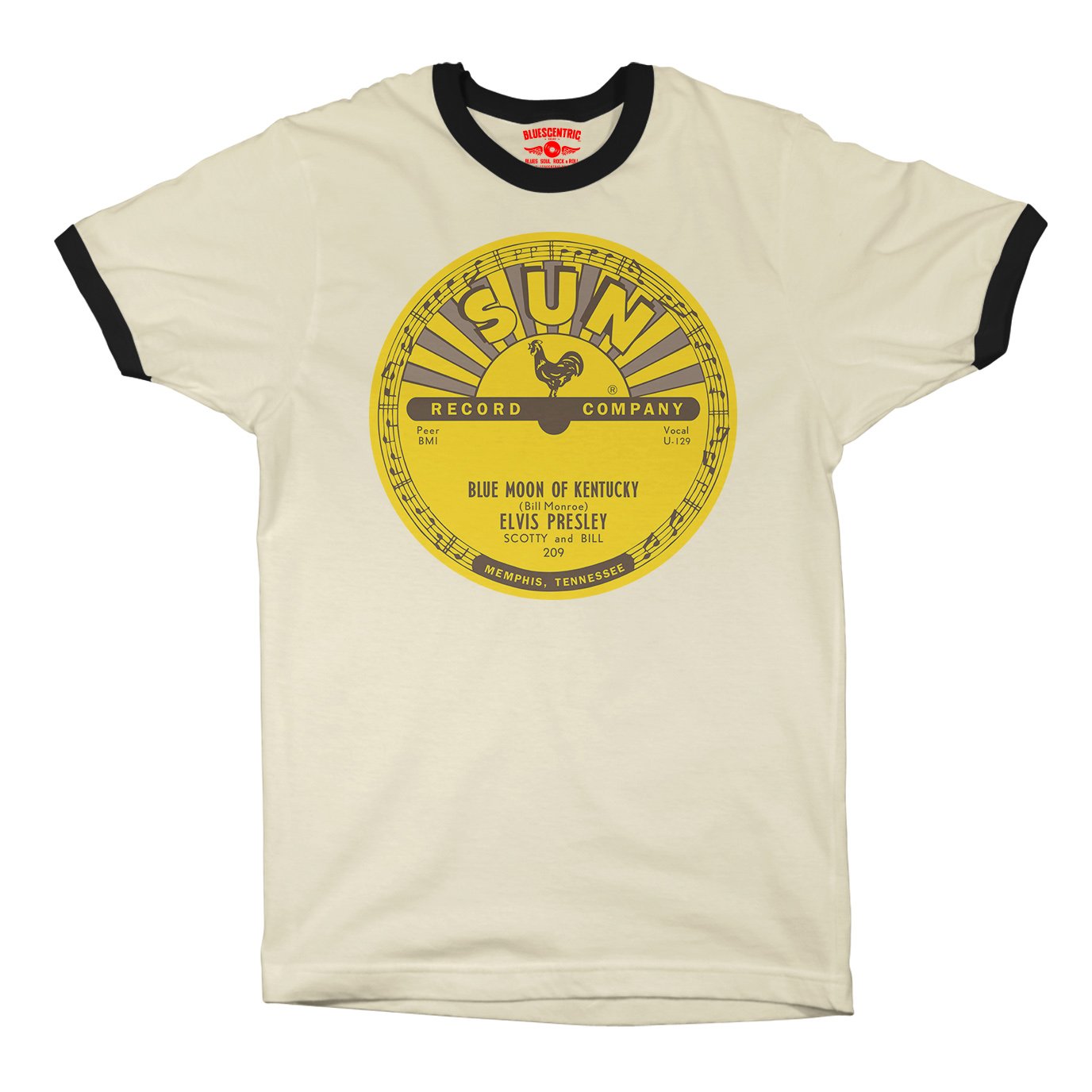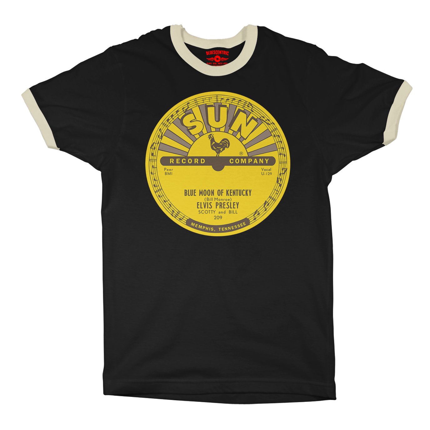 This shirt features the original Sun Records center label from Elvis Presley’s groundbreaking 1954 release of Blue Moon of Kentucky, the flip side to his debut single That’s All Right. It’s a retro nod to the moment Elvis Presley's rock ’n’ roll first sparked to life in Memphis, the elvis shirt design looks exactly like the label on that first vinyl pressing.