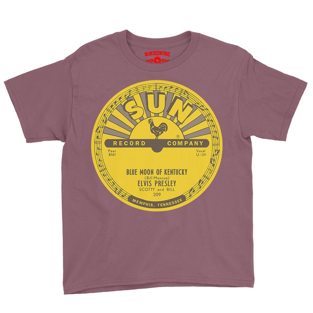 This shirt features the original Sun Records center label from Elvis Presley’s groundbreaking 1954 release of Blue Moon of Kentucky, the flip side to his debut single That’s All Right. It’s a retro nod to the moment Elvis Presley's rock ’n’ roll first sparked to life in Memphis, the elvis shirt design looks exactly like the label on that first vinyl pressing.