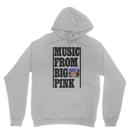 Bluescentric The Band Big Pink hoodies are printed on quality Hanes 90% cotton, 10% poly high-density cotton jersey-lined pullover with dye-matched drawstring. Light Steel is 85% cotton. Sizes are available in Small-3XL and run true.