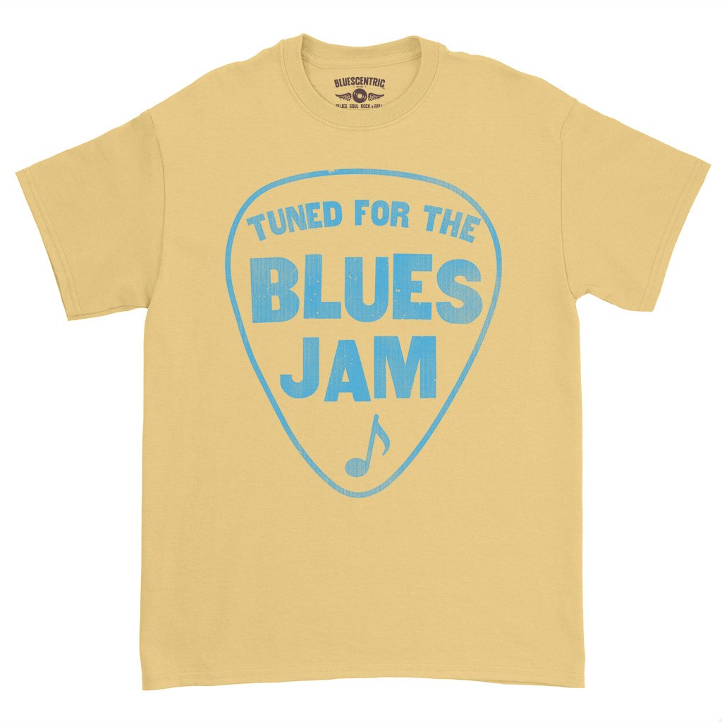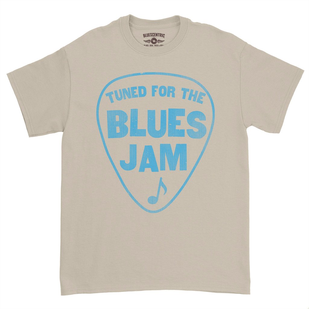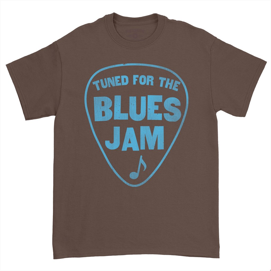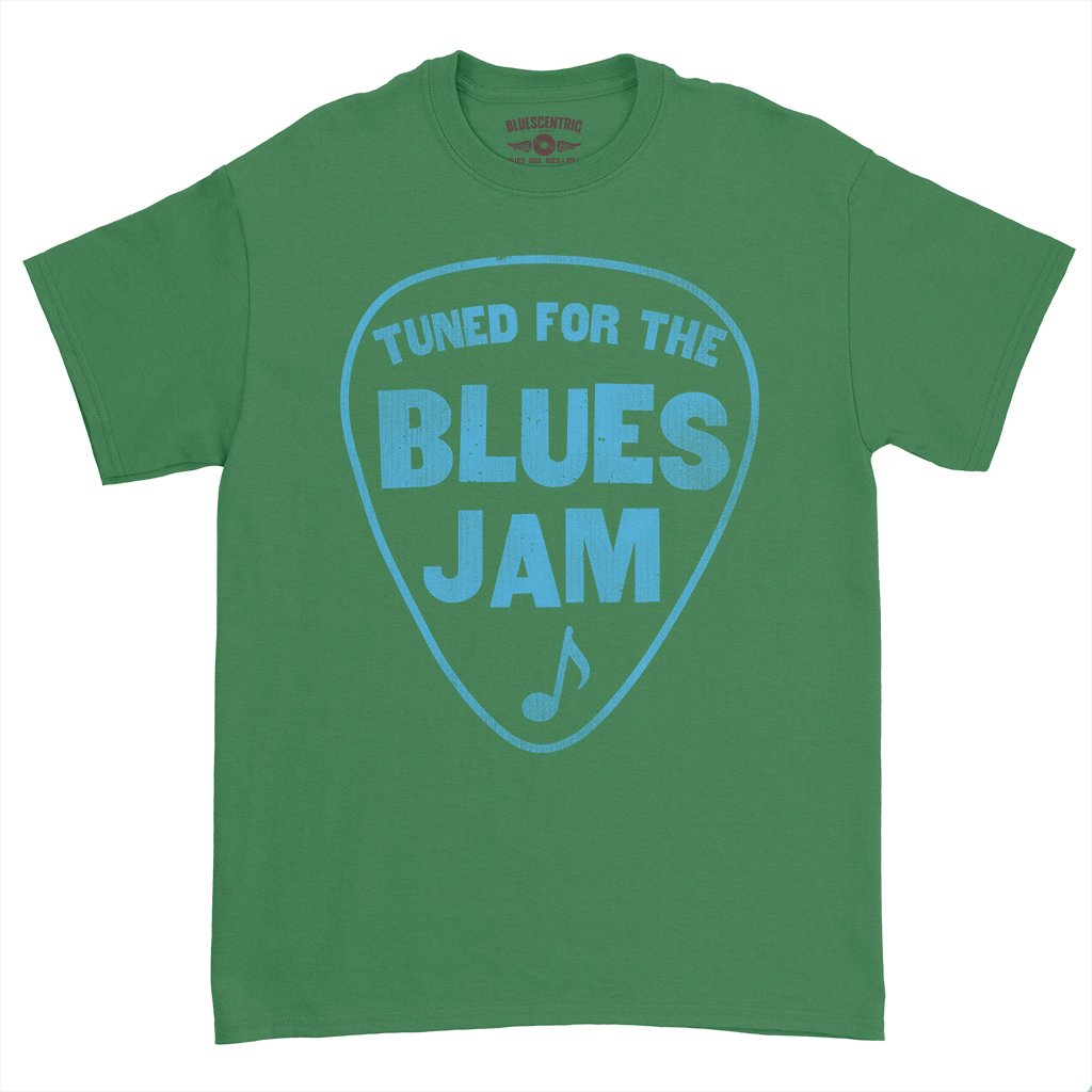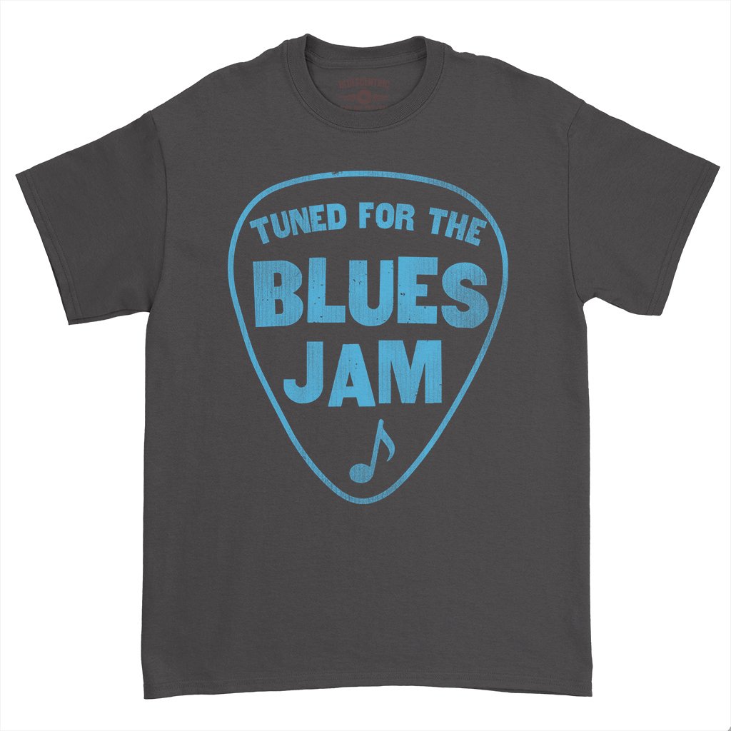 This shirt is for the blues jammmers! It reads "Tuned for the Blues Jam" inside a guitar pick, with a music note. Perfect for your next blues jam