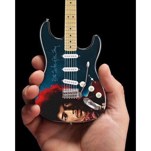 OverviewJimi Hendrix Both Sides Of The Sky Fender Stratocaster Mini Guitar Replica Collectible.Features album artwork on the body.The 2018 album is a collection of rare archival Electric Lady Studio recordings from January 1968 thru February 1970.FeaturesBrand: Axe HeavenSize: Each guitar model is approximately 10” in length.Each AXE HEAVEN® ornamental replica guitar is 1:4 scale and is individually handcrafted from solid wood, with metal tuning keys.Includes a high-quality miniature adjustable A-frame guitar stand for display.Packed in an AXE HEAVEN® guitar case gift box stamped with silver foil.All mini guitars are packed in the same style box measuring 11.75" W x 4.5" D x 1.25" HAXE HEAVEN® Miniature Replica guitars look great but are Not playable.These ornamental miniature replica guitar collectibles make great gifts for musicians & music aficionados alike!A must for Jimi Hendrix fans & collectors.Weight: approximately 14 oz.Officially licensedProduct materials are sourced from Brazil & Indonesia then assembled & packaged in the USA.