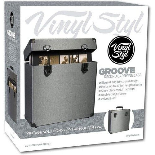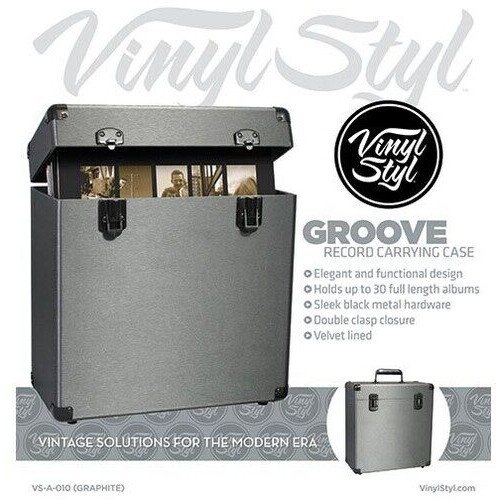 Vinyl Styl™ Groove 12 Inch Vinyl Record Travel Carrying Case (Graphite/Dark Gray)Designed with the record collector and the DJ in mind, the Vinyl Styl™ Groove Record Carrying Case is built tough for traveling to and from gigs or storing the scores from your latest dig. Storage for 30 or more albums means you’ll have plenty of space for hours of music or other gear.Specially built to protect vinyl records, this carrying case will provide ample every day protection with its reinforced metal corners, metal hinges and hardware, and soft interior lining.Vinyl Styl – Sound Solutions for the Modern EraFeatures:Elegant and functional designHolds 30+ standard LPsSleek black metal hardwareDouble clasp closureVelvet linedVinyl Styl provides the highest level of sustainability for your records and accessories, while most importantly remaining affordable. Protect your collection with Vinyl Styl today.