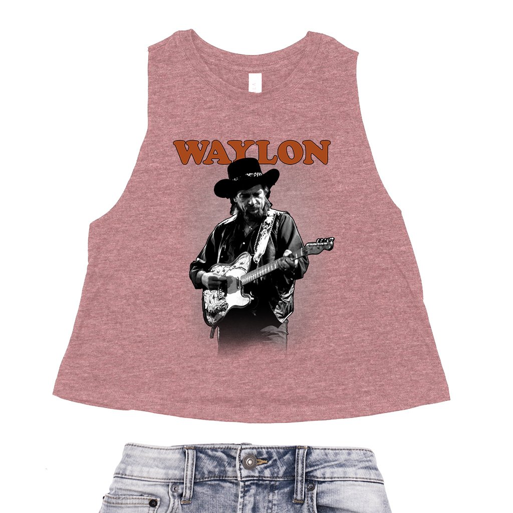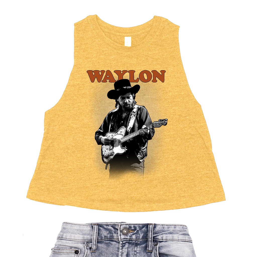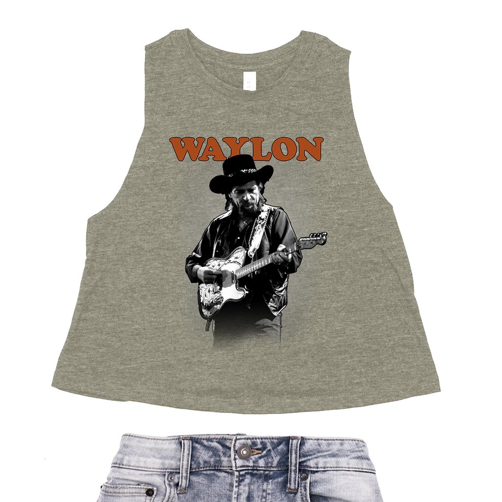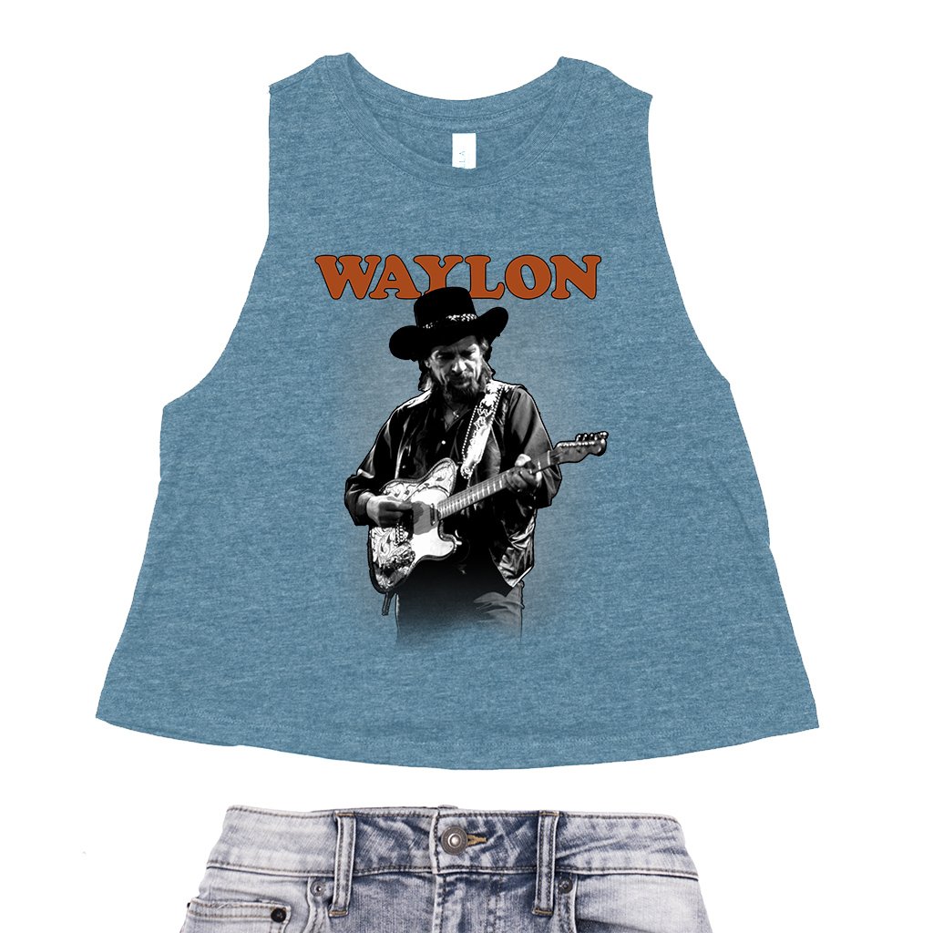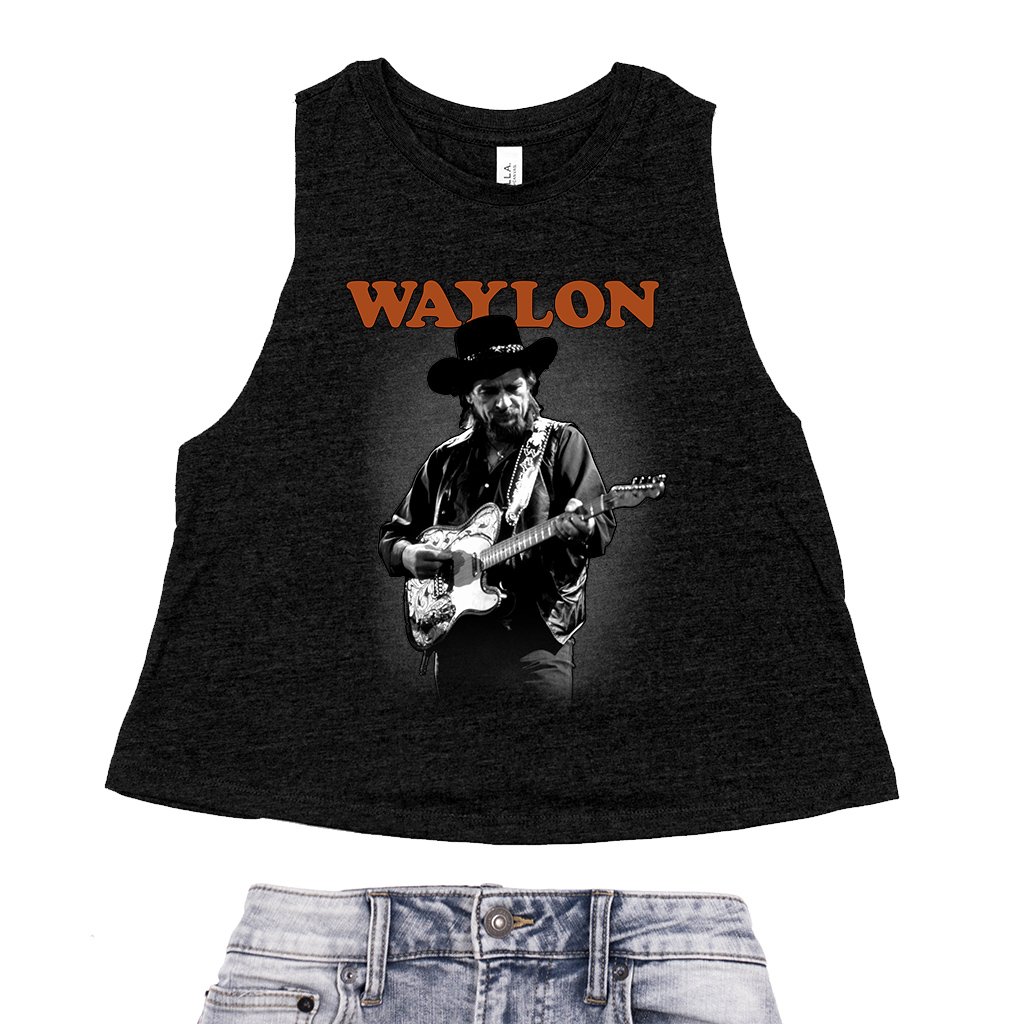 Celebrate the outlaw country legend with this official Waylon Jennings design, featuring a moody black-and-white shot of Waylon locked into his Telecaster, topped with his name in a bold western type.