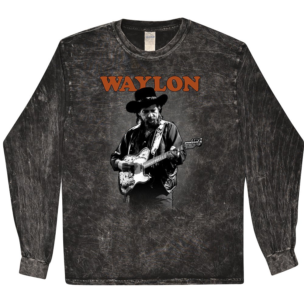 Celebrate the outlaw country legend with this official Waylon Jennings design, featuring a moody black-and-white shot of Waylon locked into his Telecaster, topped with his name in a bold western type.