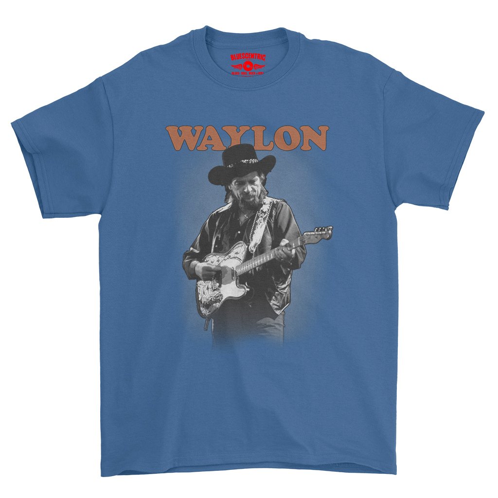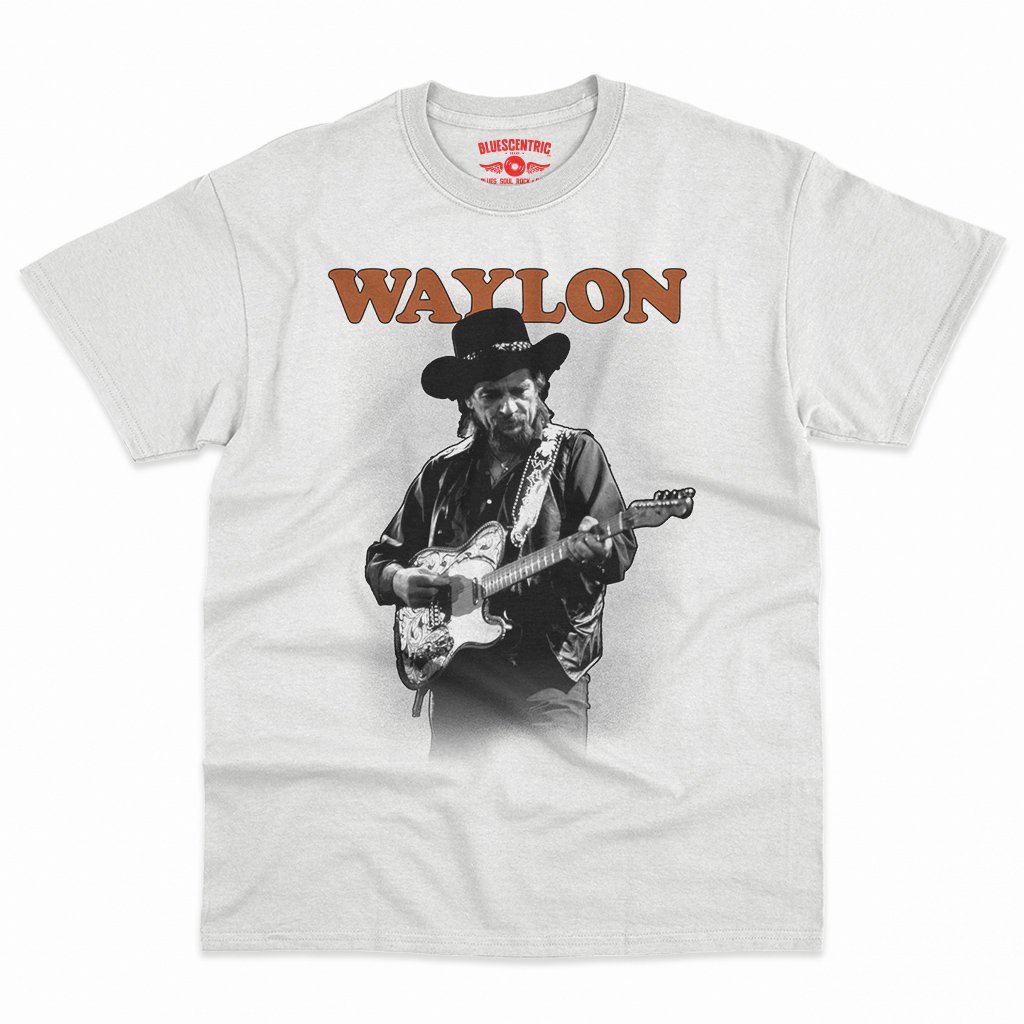 Celebrate the outlaw country legend with this official Waylon Jennings design, featuring a moody black-and-white shot of Waylon locked into his Telecaster, topped with his name in a bold western type.